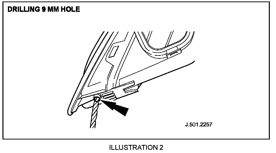 4. Carefully drill a 9 mm diameter hole upwards into headlamp using the stub pipe as a guide (Illustration 2).