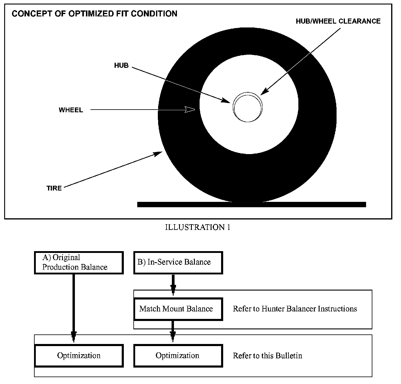 Tire/wheel assembly is mounted to the vehicle's hub in a manner that allows the Radial Force 'high point' of the assembly to be neutralized by taking up the inherent clearance in the wheel to hub mating surface (Illustration 1). The Hunter balancing machine identifies high point of the wheel/tire assembly.