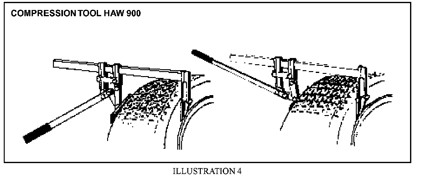 1. *Compress the inflated tire at the bead, and the shoulder with compression tool HAW 900 (available through SPX-OTC) (Illustration 4).*
