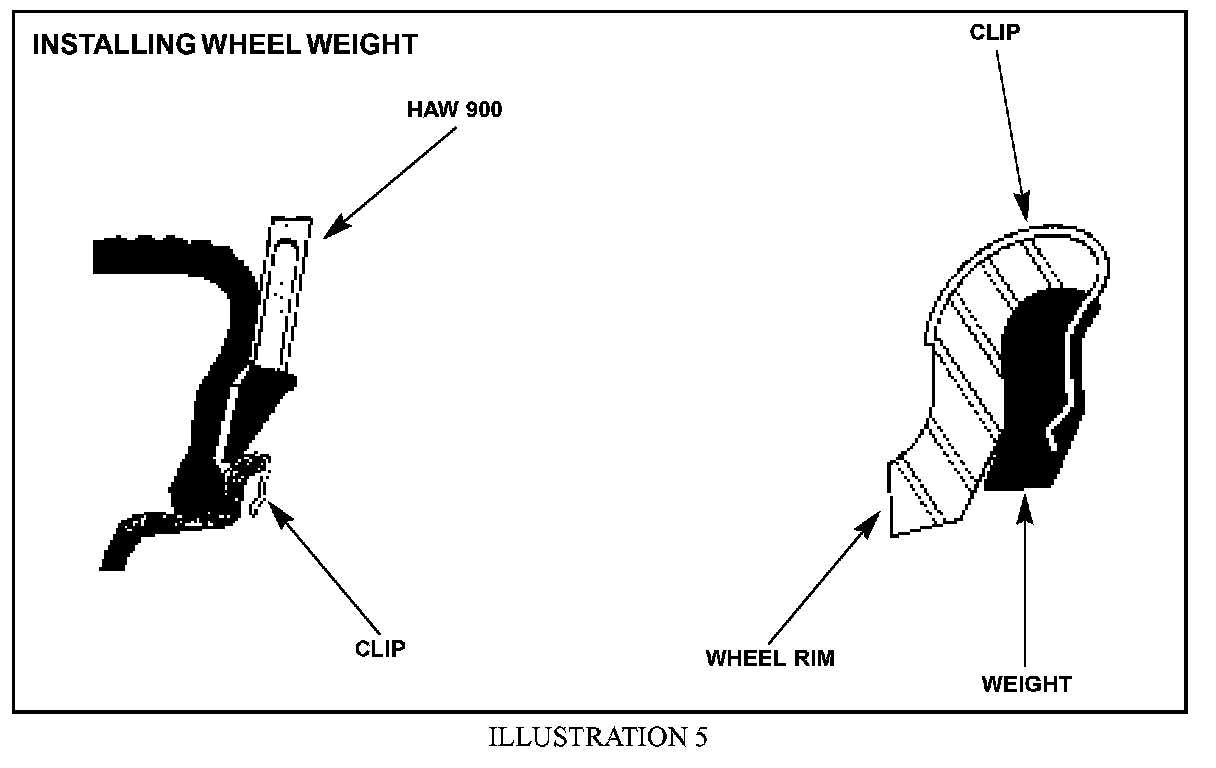 2. Insert the wheel weight clip between the tire bead and the road wheel as shown in Illustration 5. Release the compression tool.