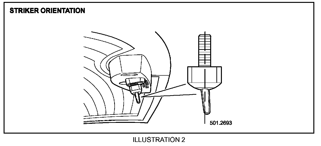 A distance of 2.5 mm or as near to it as possible should be aimed for, but not greater than 2.5 mm. The striker must be adjusted in 360 degree increments (complete turns) as the striker can only be oriented in one position (Illustration 2).