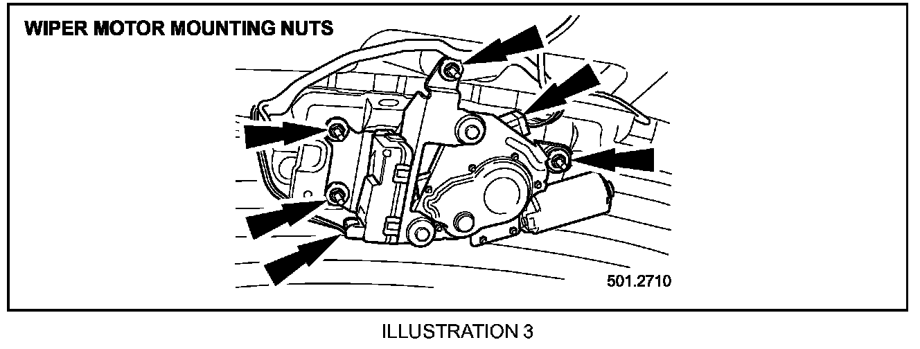25. Disconnect both electrical connectors, remove the four rear wiper motor securing nuts and remove the rear wiper motor (Illustration 3).