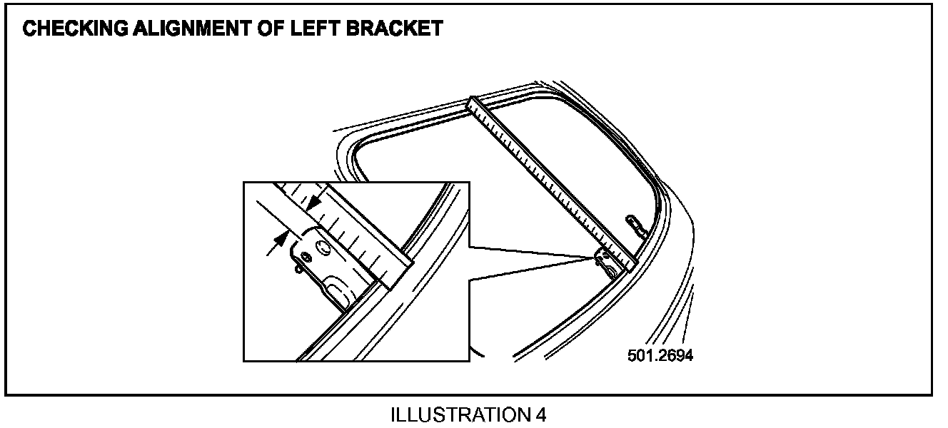 30. Place a suitable straight edge tool onto the liftgate aperture upper/lower flanges, measure distance between the end of the bracket and the straight edge (Illustration 4).