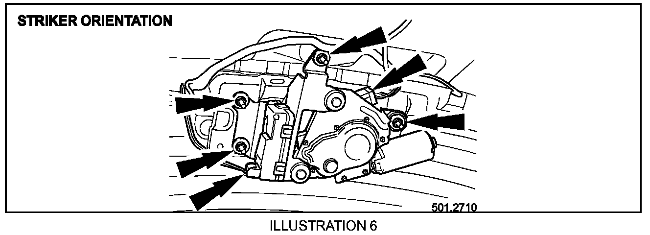 Should a customer experience the concerns described above, check and adjust the liftgate glass striker and the rear wiper motor bracket. Follow the workshop procedure outlined below.