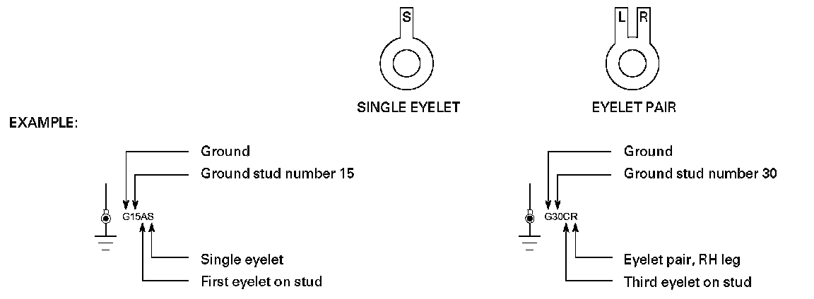 There may be up to three eyelets on one ground stud. A, B and C are used to indicate the position of the eyelet on the stud: A - first (bottom), B - second (middle), C - third (top). Two eyelet variations are used: a single eyelet and an eyelet pair. The single eyelet has a single 'leg', which is identified by an S; the eyelet pair has two 'legs', identified as L (left) or R (right).