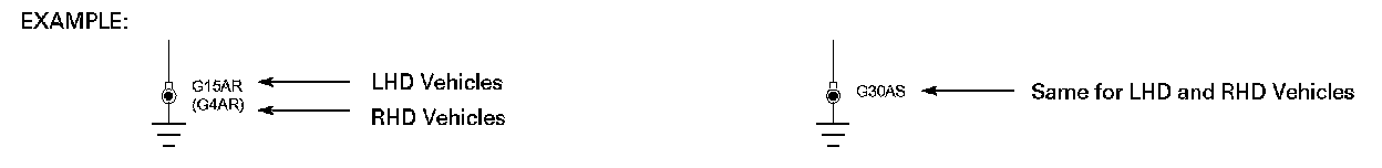 On figures where LHD and RHD circuits are combined and the ground designation differs from LHD to RHD, the RHD ground is shown in parentheses. If the ground designation is the same for LHD and RHD, only one ground designation is used.