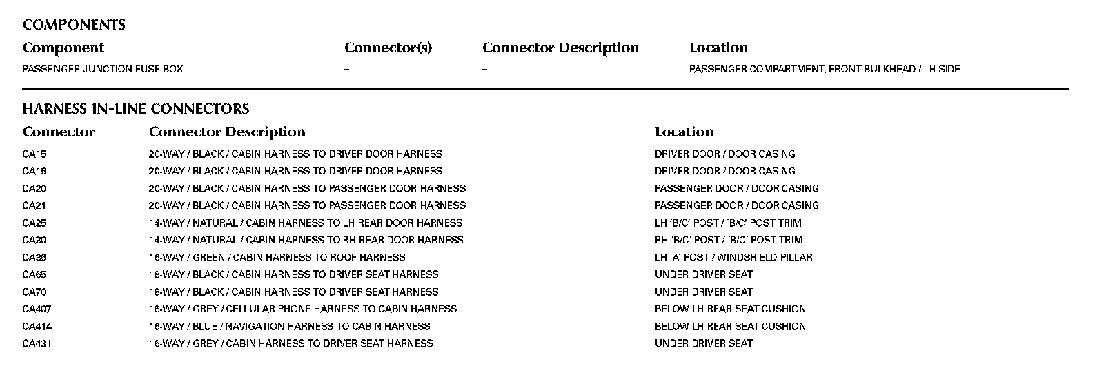 Locations: The location views for Ground Points, In-Line Harness Connectors, Harnesses, and Control Modules depicted within these diagrams can be found at Vehicle/Locations. Locations