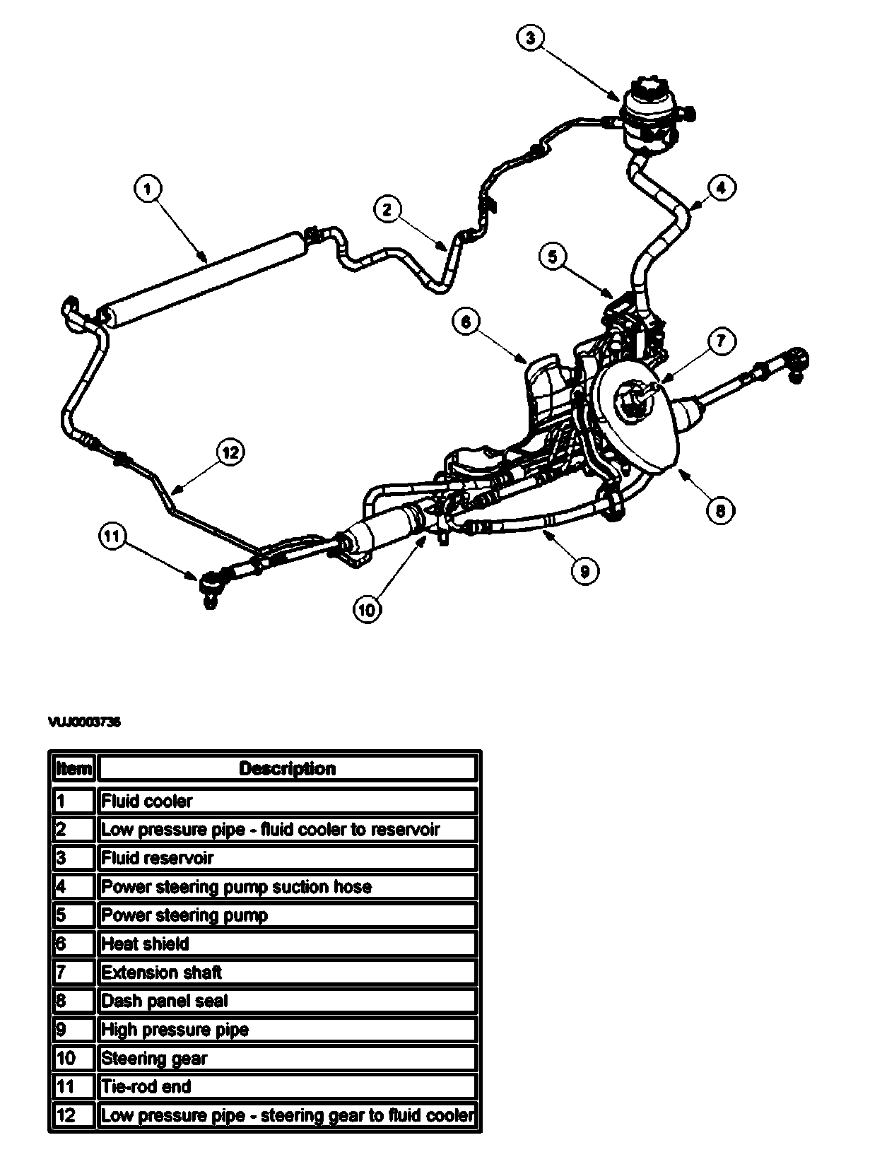 The power steering system uses a rack and pinion type variable ratio steering gear. The power steering pump is belt driven on all model variants and the power steering oil cooler is of a wire bound tube type and is mounted in front of the radiator.