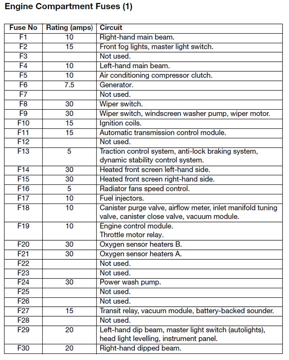 Engine compartment fuses (F1 - F30)