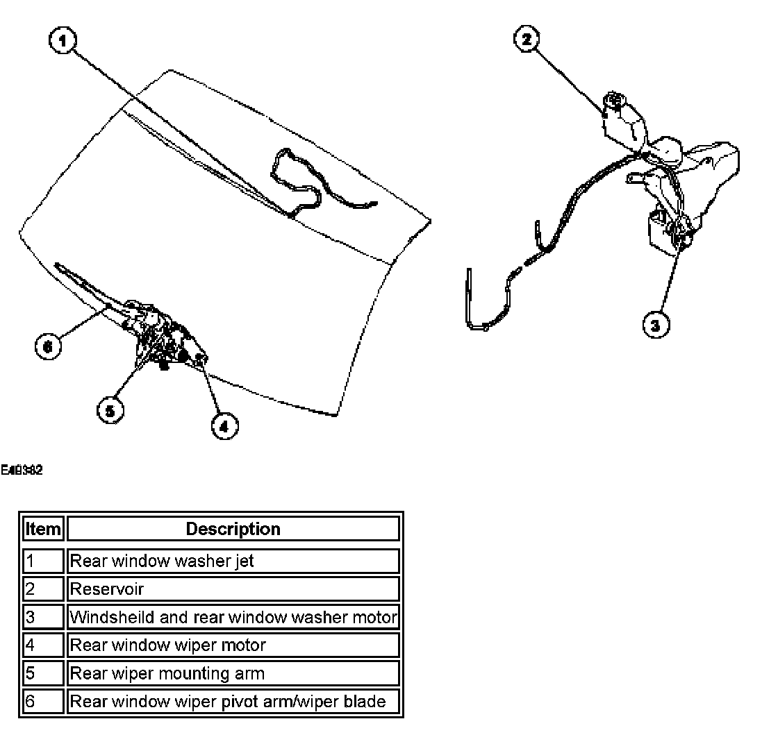 The rear wiper and washer system consist of the following components, wipers and washers, pivot arm, wiper motor, reservoir (uses standard front washer reservoir) and washer pump.