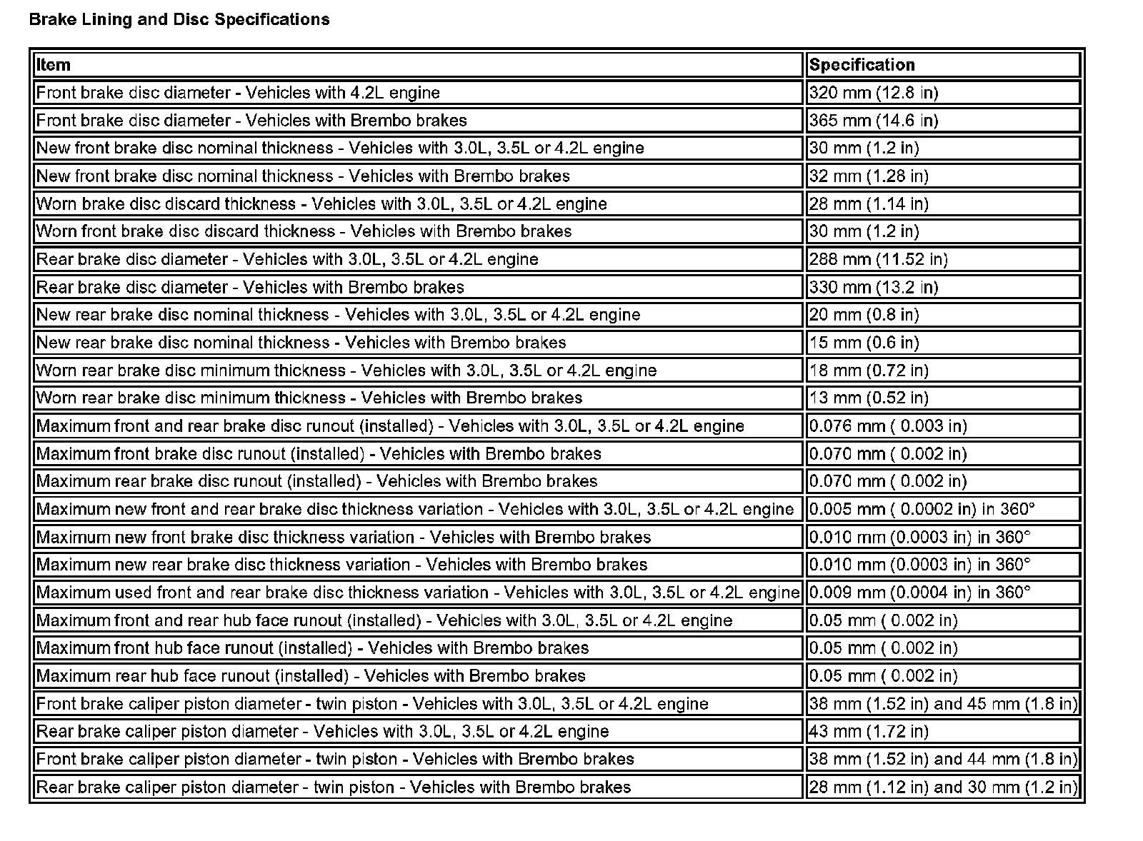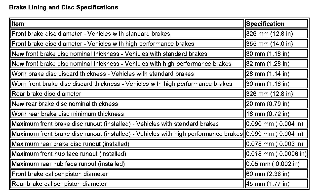 Brake Lining and Disc Specifications