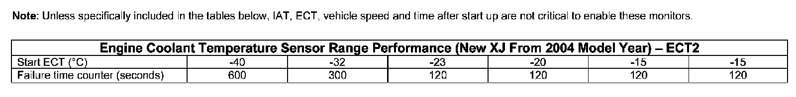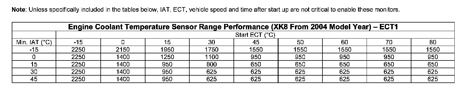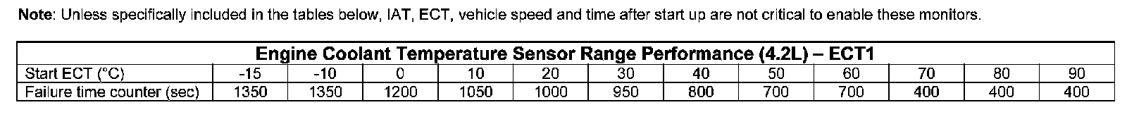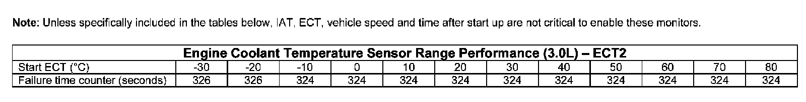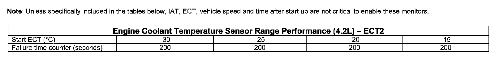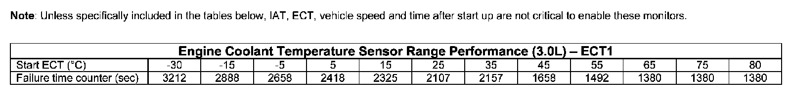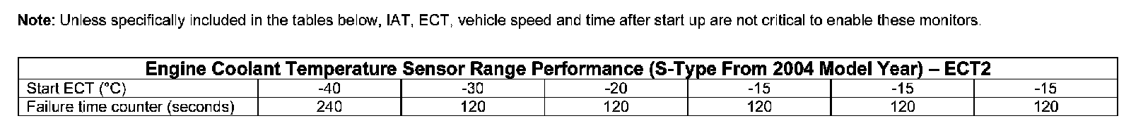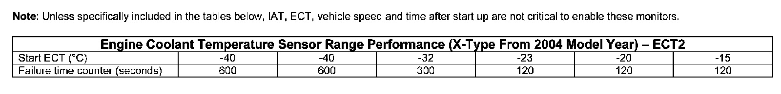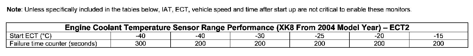 There are two parts to the range/performance monitor. The first part ensures that the ECT reaches the level required for closed loop fuelling. The second part ensures that the ECT reaches 80�C. Both parts of the monitor operate with the same strategy, are one shot monitors and each part has its own calibration values. If the ECT and intake air temperature are above the required level for each monitor part then the following strategy will be carried out otherwise the counters for that monitor part are reset.