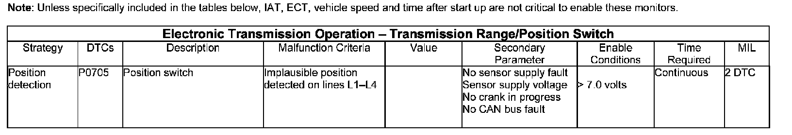 The TCM can identify errors with the position switch located within the transmission. If an unrecognized position code is read by the TCM, a plausibility fault will be logged. (A code is checked between positions).