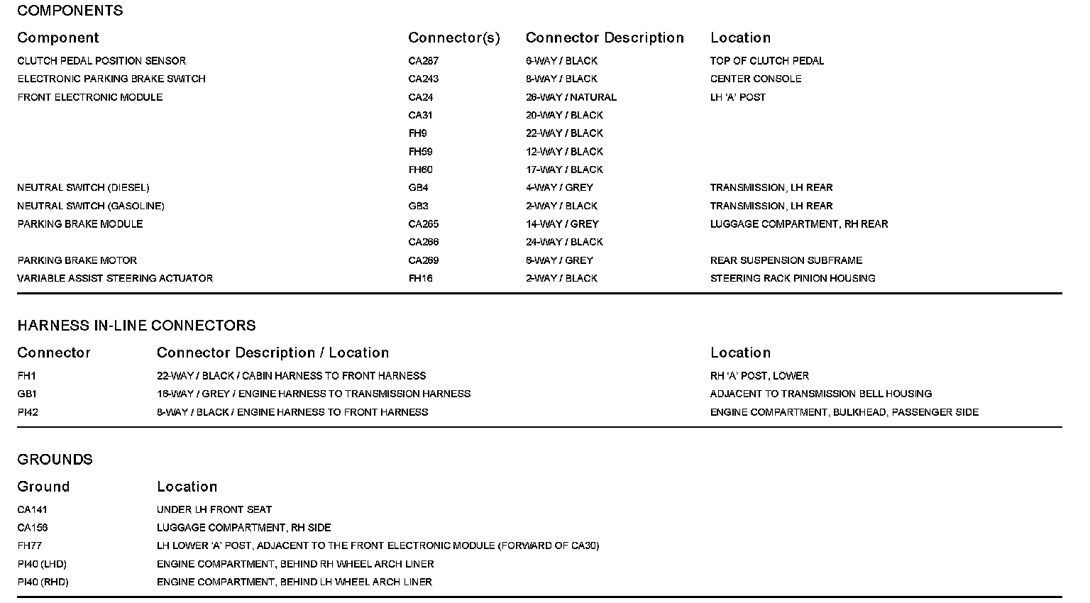 Locations: The location views for Ground Points, In-Line Harnesses, and Control Modules depicted within these diagrams can be found at Vehicle/Locations. Locations
