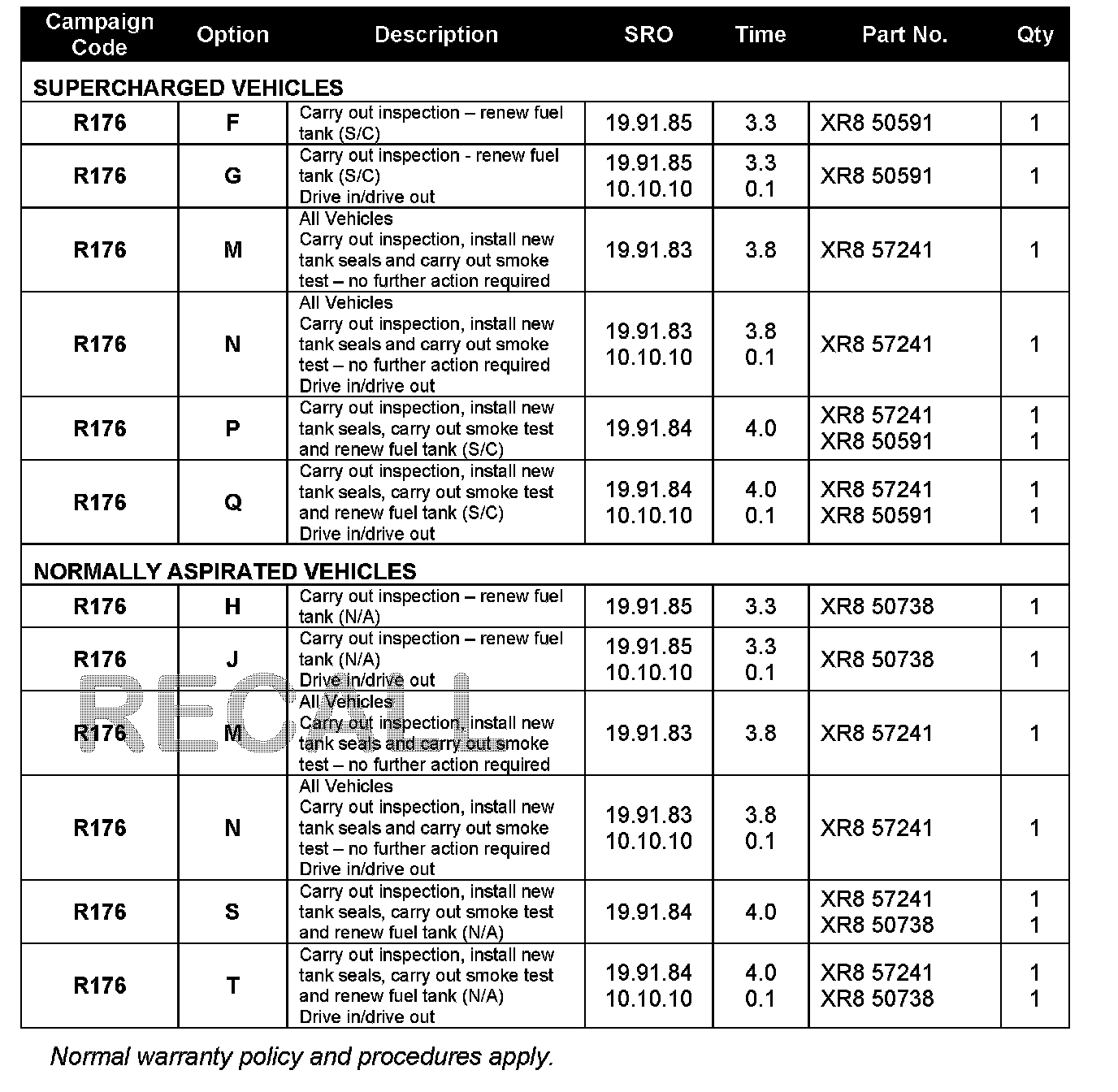Warranty claims should be submitted quoting Campaign Code R176 together with the relevant option code from the table. This will result in payment of the stated time and associated parts. As option codes are used, there is no requirement for you to enter parts or labor; they are repeated here for information only. The option that allows for the drive in/drive out allowance can only be claimed if the vehicle is brought back into the workshop for this action alone to be undertaken.
