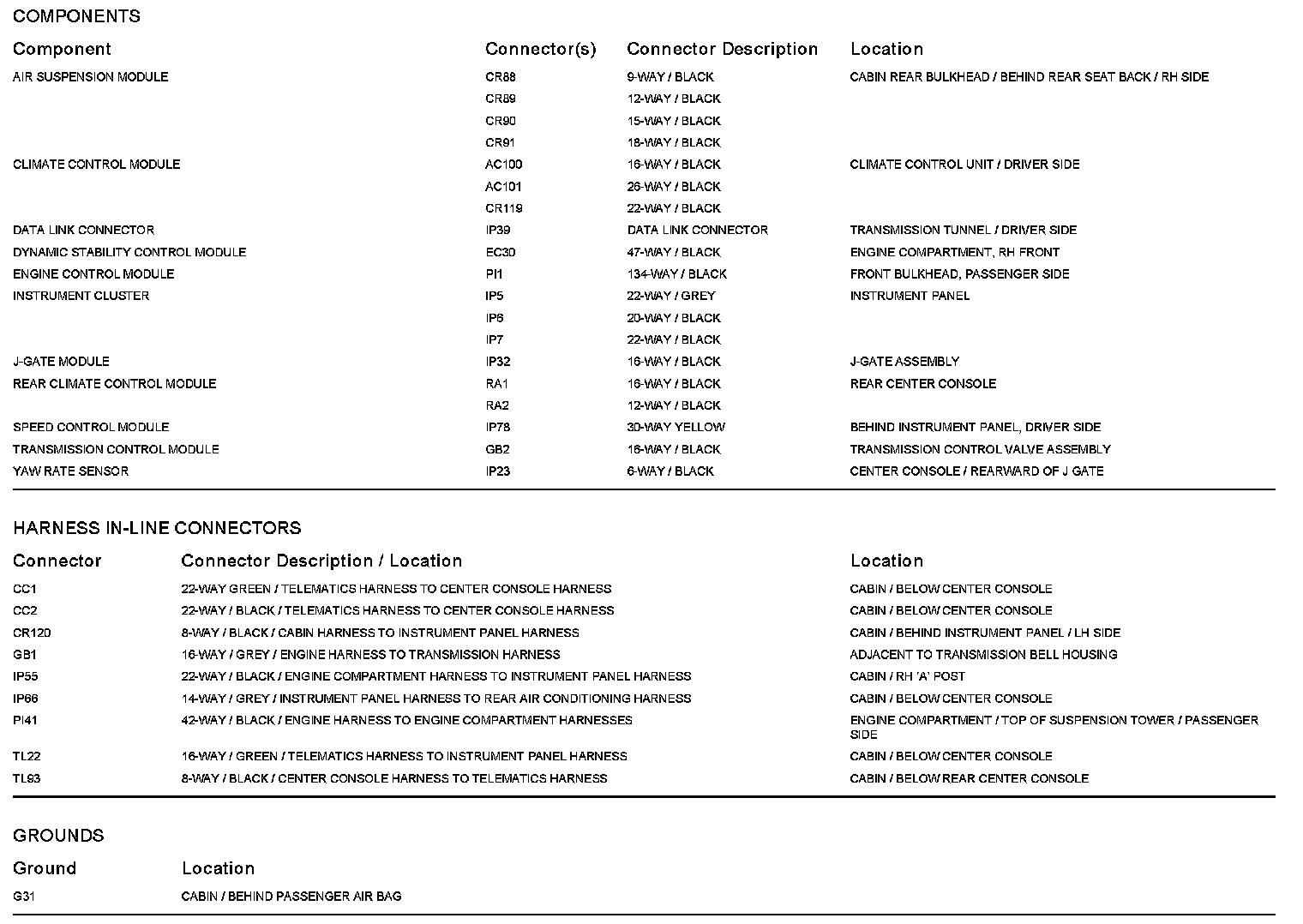 Locations: The location views for Ground Points, In-Line Harness Connectors, Harnesses, and Control Modules depicted within these diagrams can be found at Vehicle/Locations. Locations