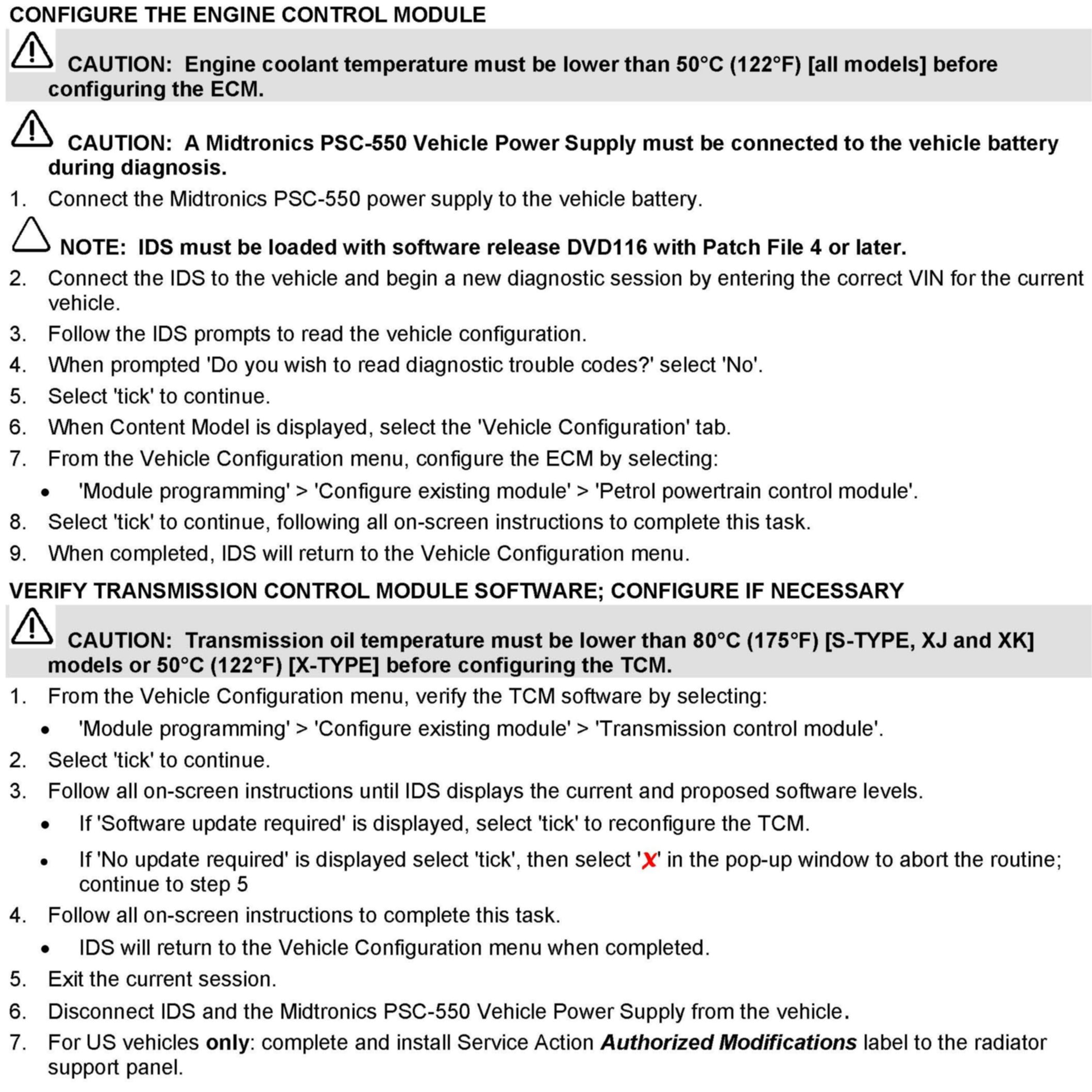 Owners will be notified by Customer Letter of this Recall with the request that they contact a dealer to have the update(s) performed. At the time of customer appointment, ensure that all outstanding service campaigns for each individual vehicle are identified and allocate sufficient time and resources to complete all campaigns. To identify repaired vehicles, US dealers must complete and install a Service Action 'Authorized Modifications' label on the radiator support panel. California dealers are required by the California Code of Regulations to complete a salmon-colored 'Vehicle Emissions Recall - Proof of Correction' certificate. This form must be provided to the customer for vehicles registered in California when the Recall work has been completed.