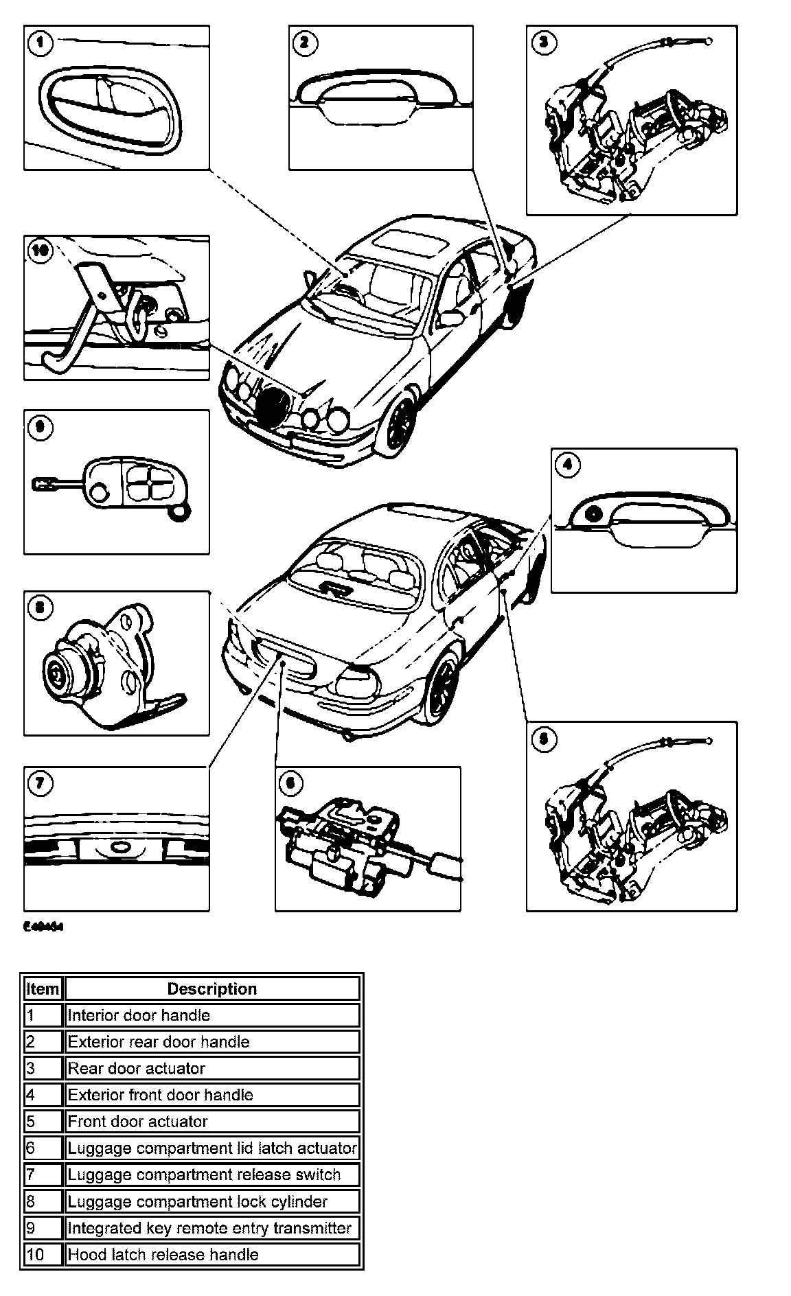 When the vehicle is not locked, each door catch can be externally released by the corresponding exterior door handle which is operated by a single rod. When unlocked, or central locked, the door latches can also be released by the interior handles, each of which are operated by a single cable. Operation of the front door interior handles will also unlock the rear doors. Use of the key in the driver door lock cylinder operates the lock by a short rod to provide locking of the door latch. This in turn locks all other doors and the luggage compartment through the central locking system. These locking functions can also be achieved by use of the remote transmitter.