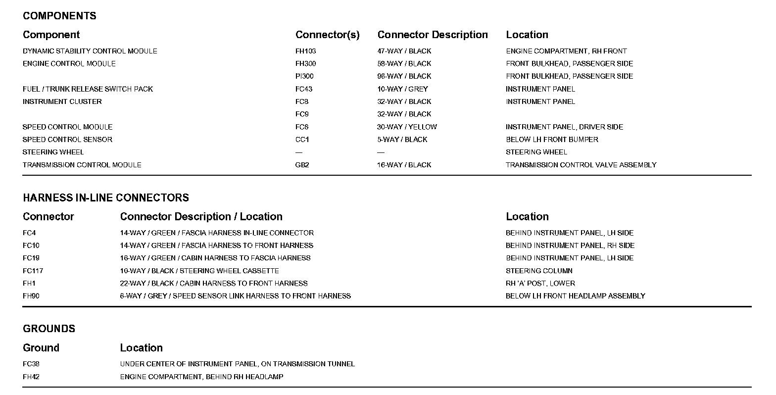 Locations: The location views for Ground Points, In-Line Harness Connectors, Harnesses, and Control Modules depicted within these diagrams can be found at Vehicle/Locations. Locations