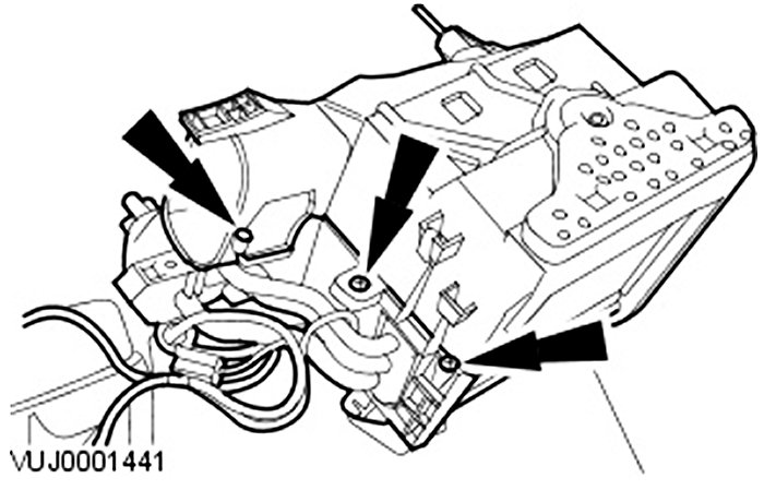 8. Remove the heater core and evaporator core housing retaining bolts.