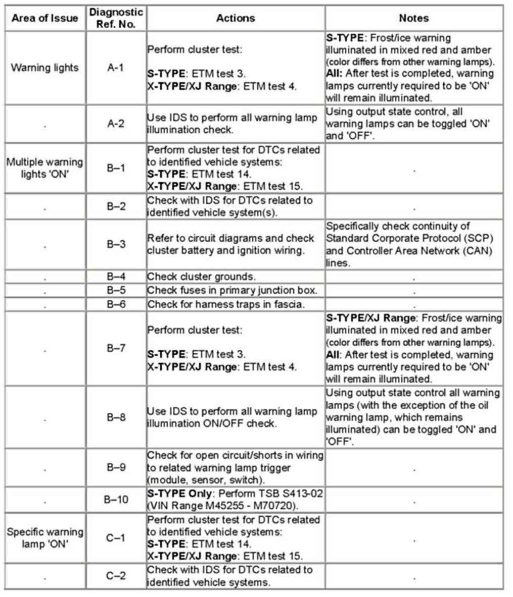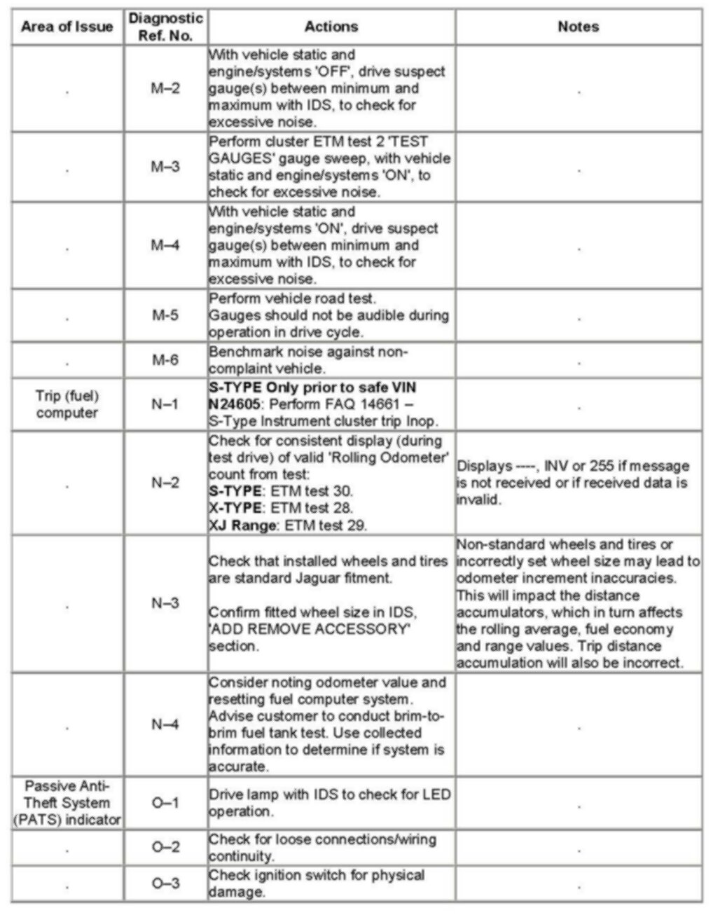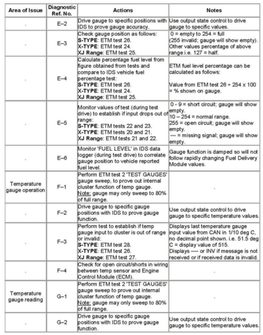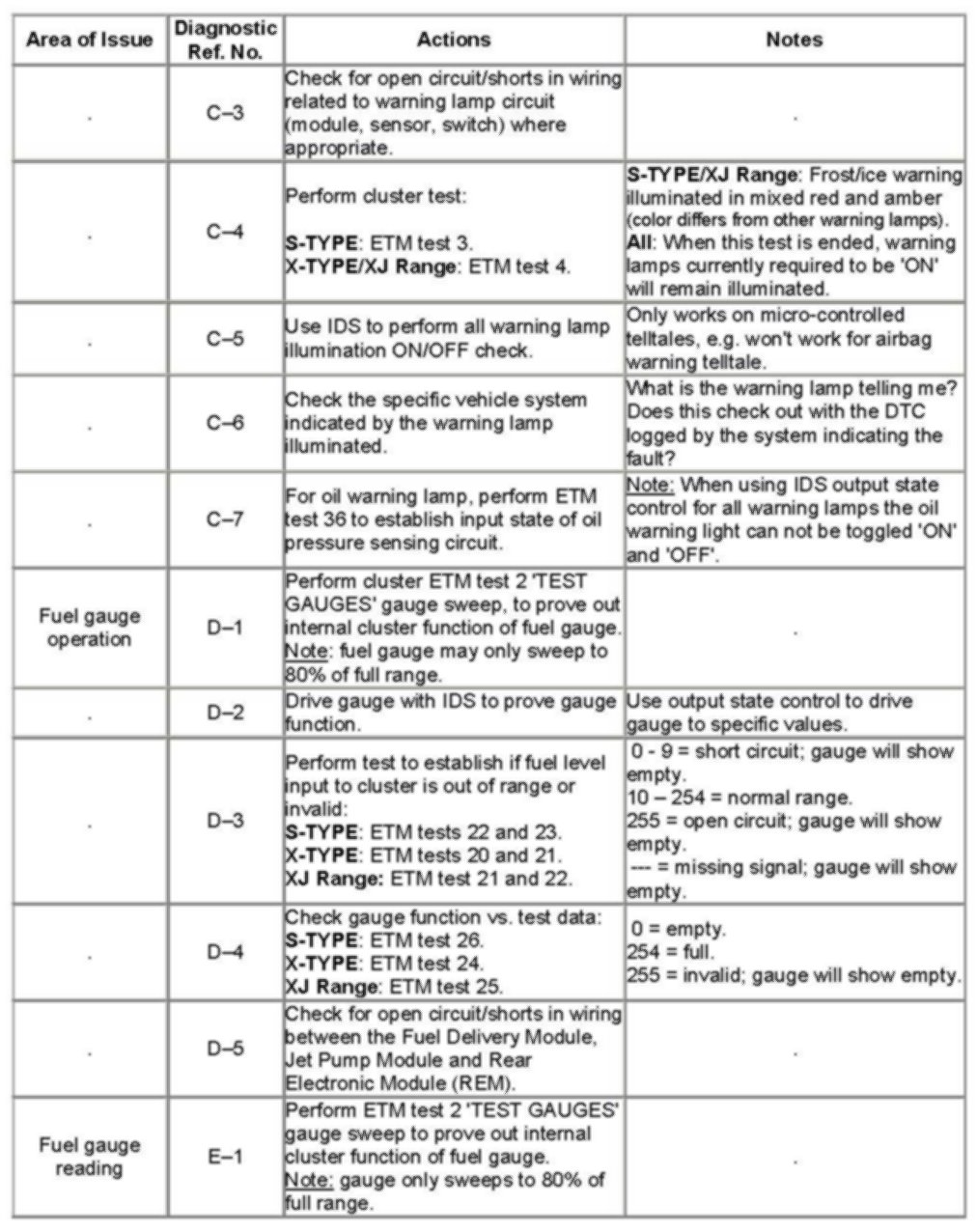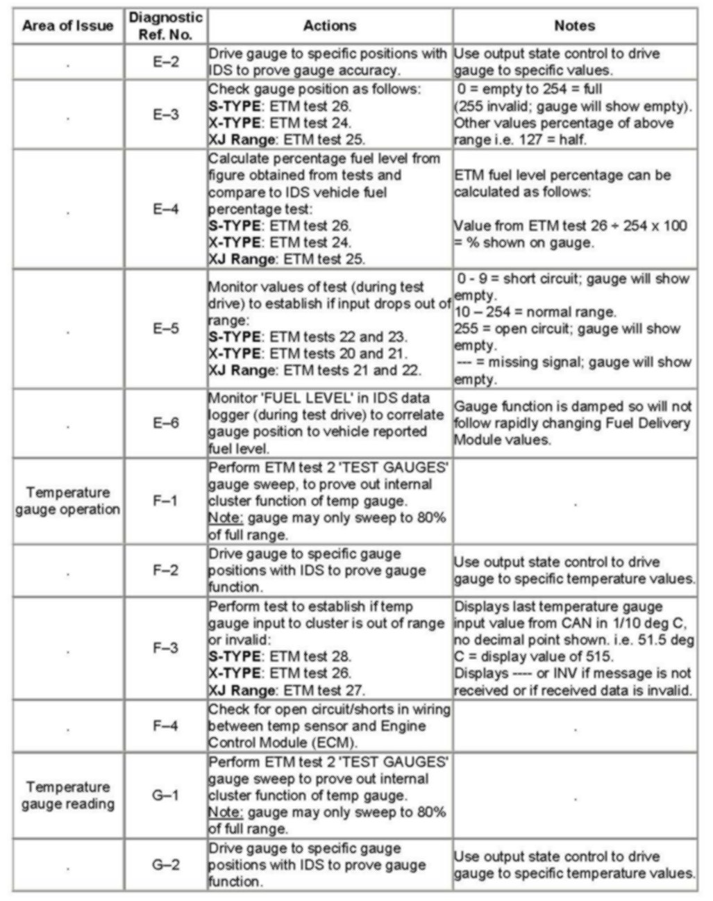 2. Perform each of the "Actions" listed for the identified "Area of Issue", in succession, referring to the relevant model's ETM Table, as required, to complete the "ETM Test No." specified.