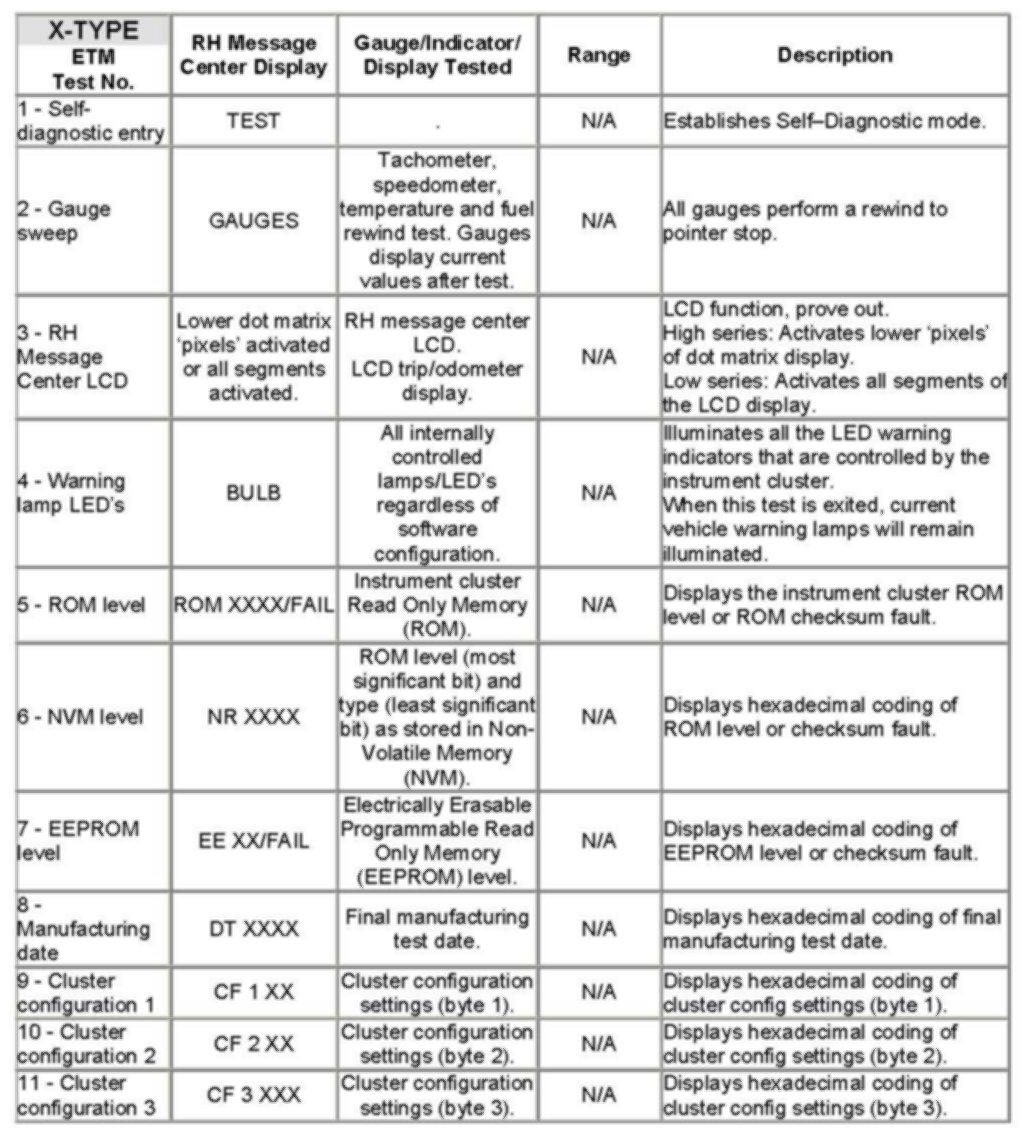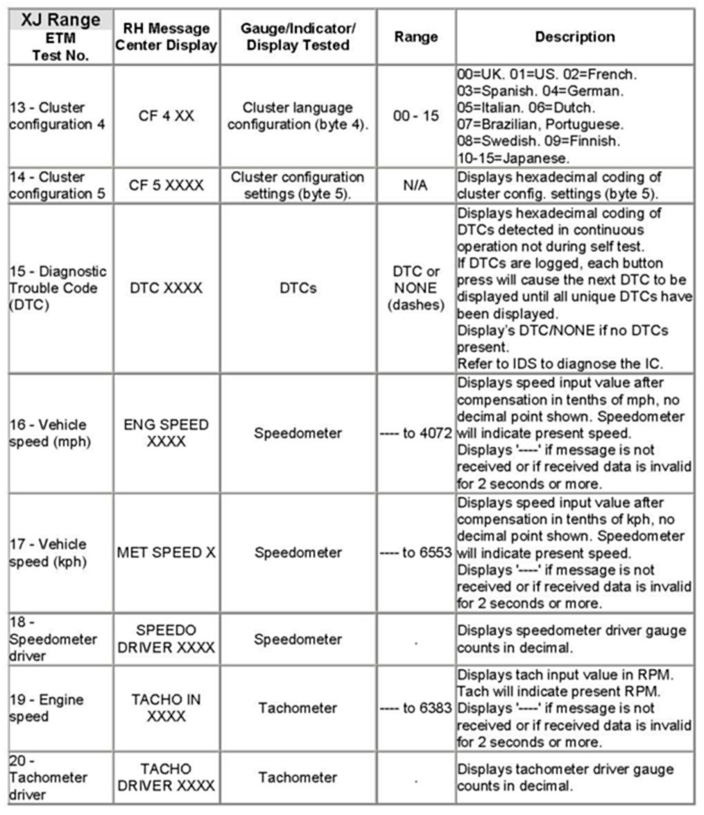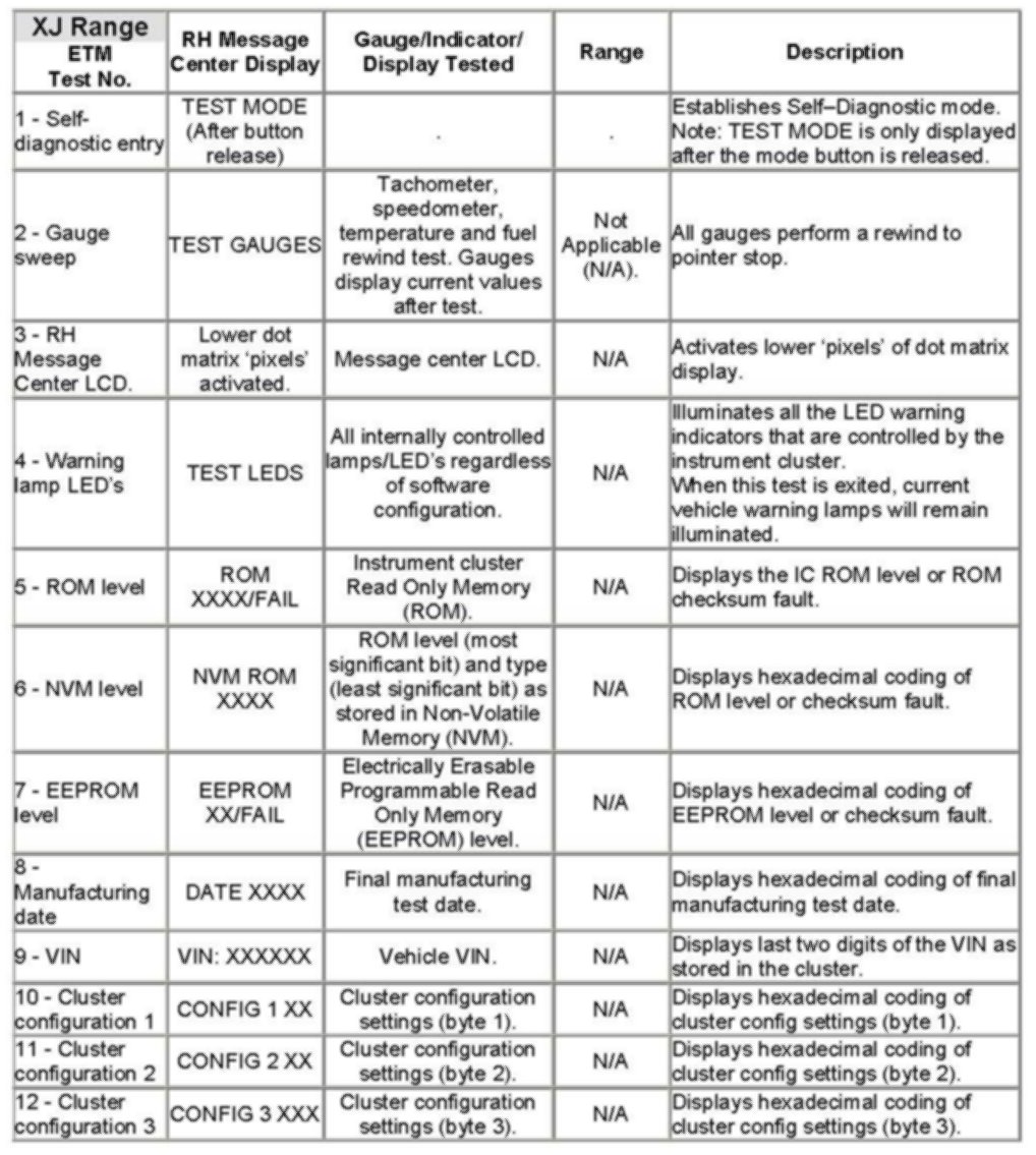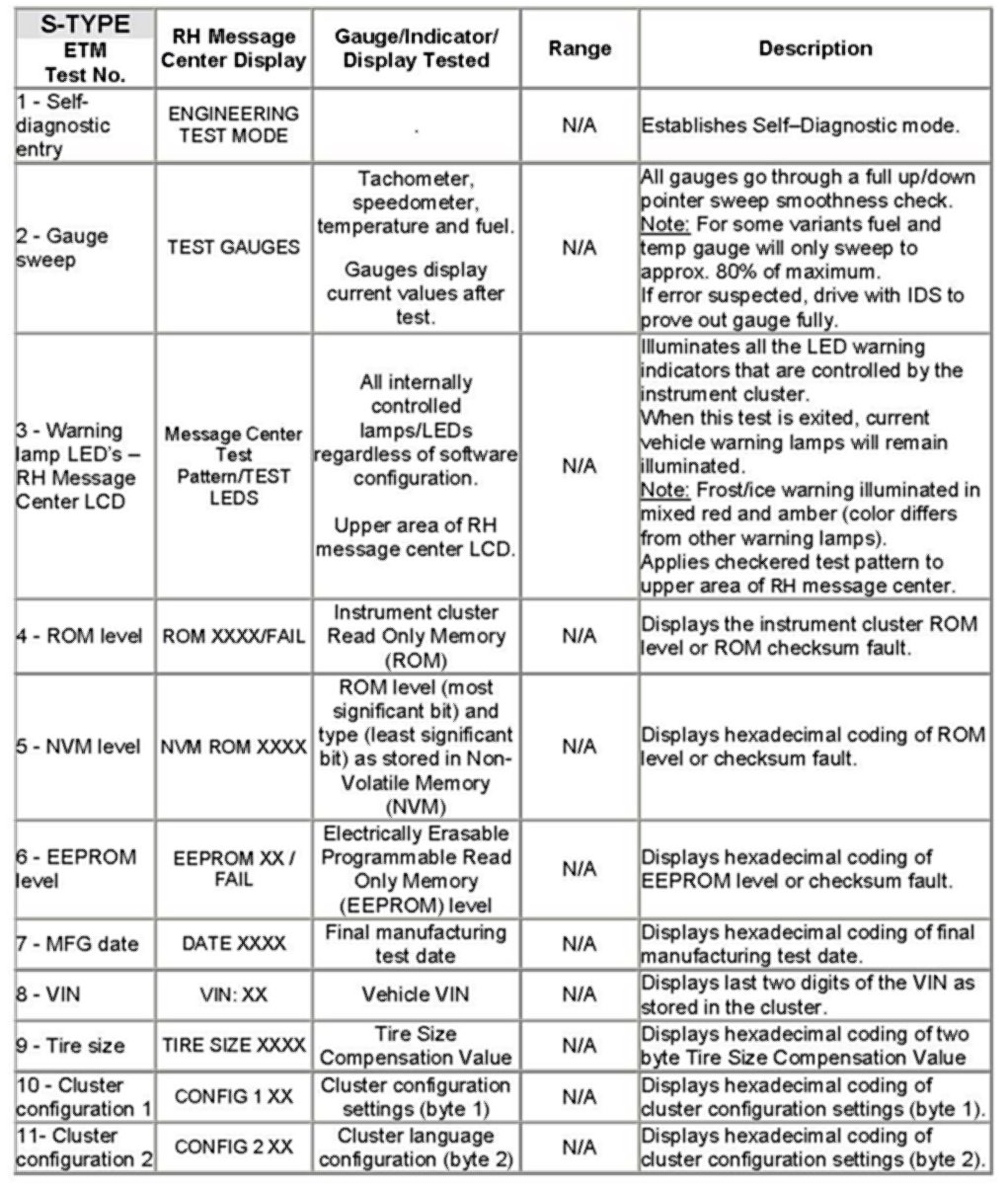 The Instrument Cluster (IC) installed from the start VINs listed above contains a self- diagnostic feature known as Engineering Test Mode or ETM. The ETM can display the status of IC inputs as well as providing a number of other useful features.