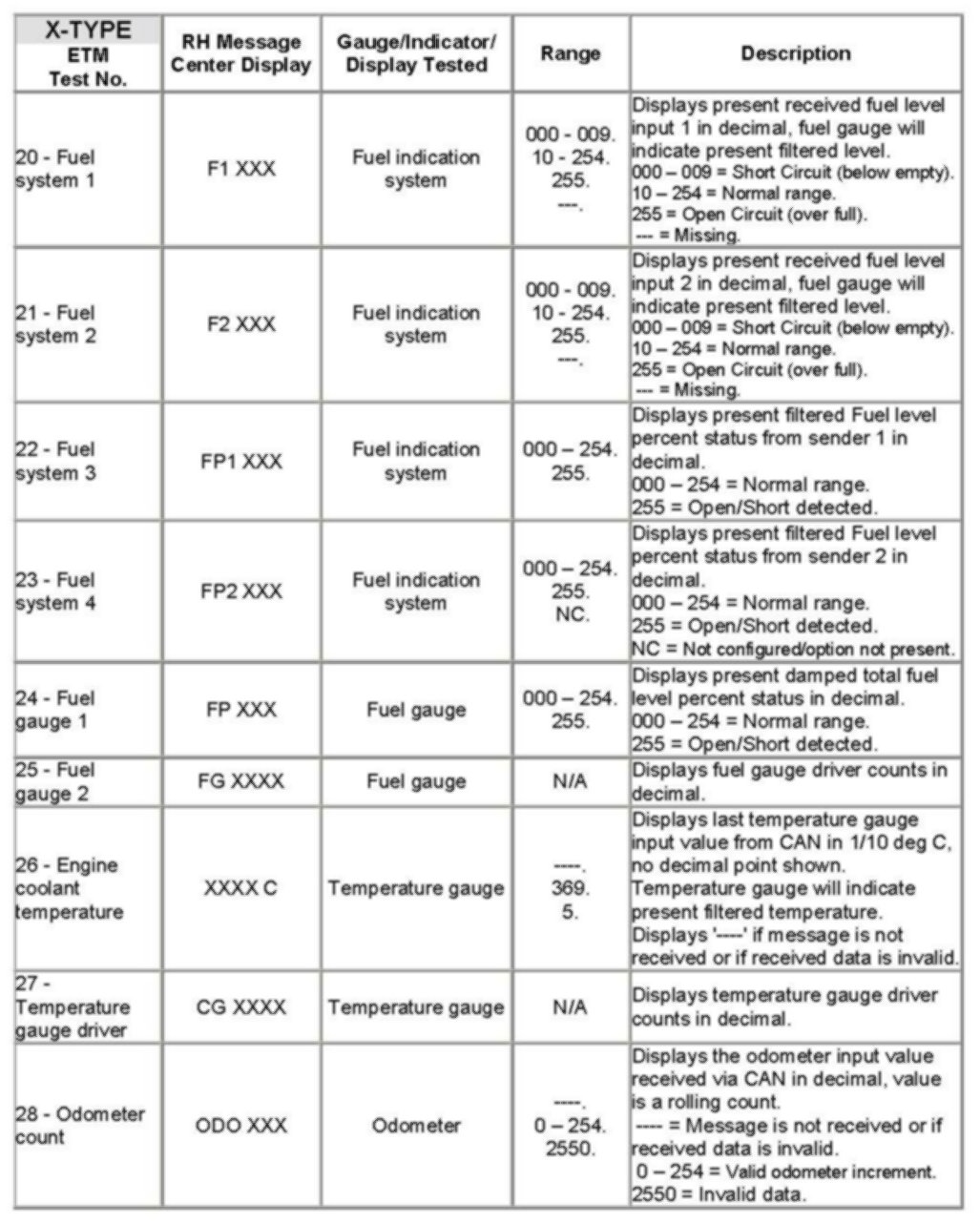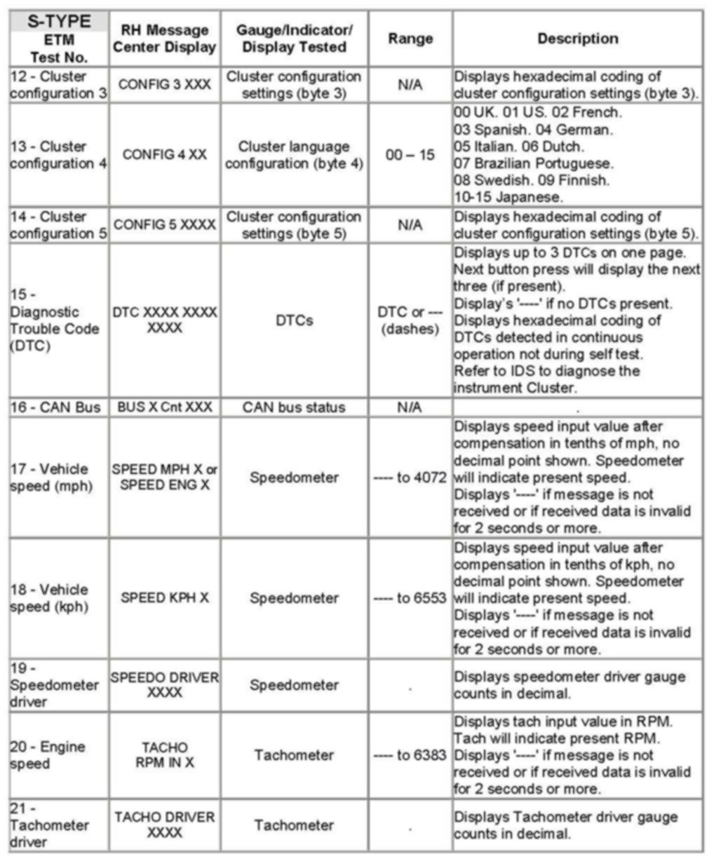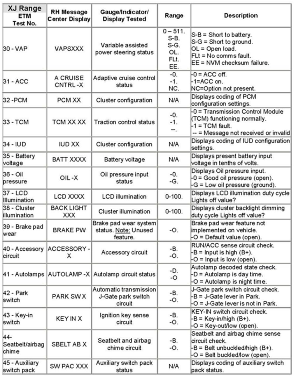 The Instrument Cluster (IC) installed from the start VINs listed above contains a self- diagnostic feature known as Engineering Test Mode or ETM. The ETM can display the status of IC inputs as well as providing a number of other useful features.