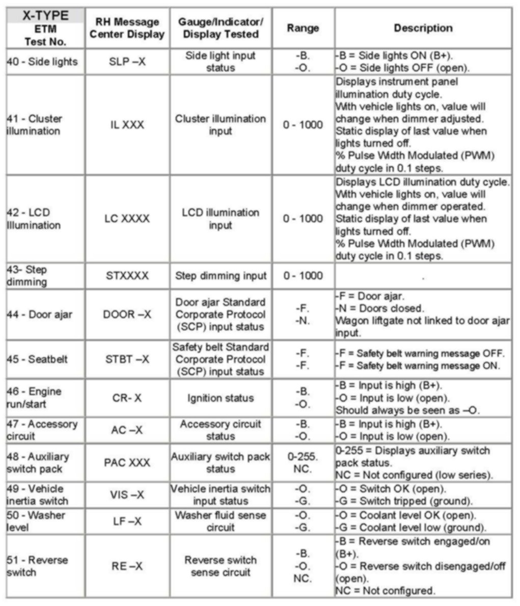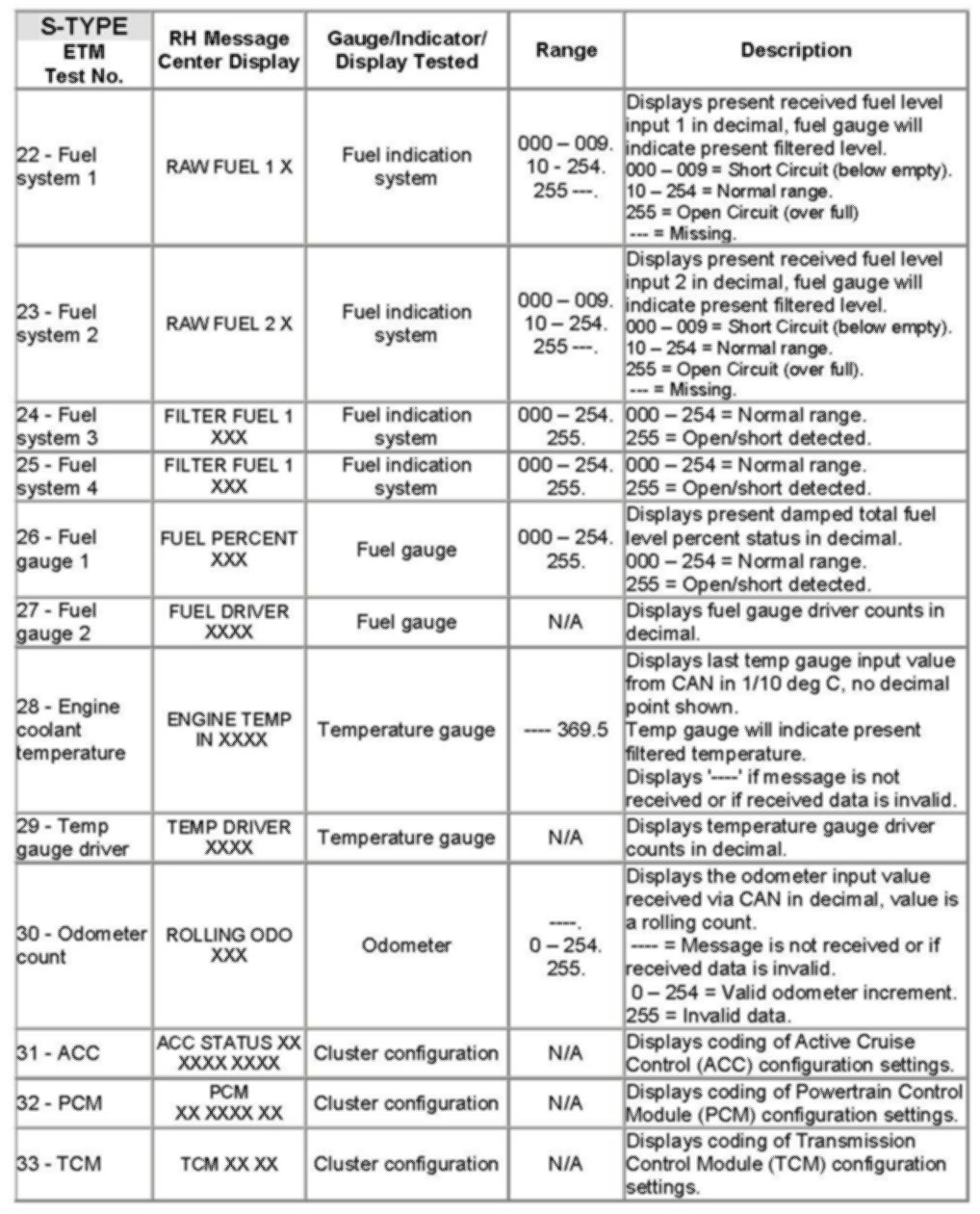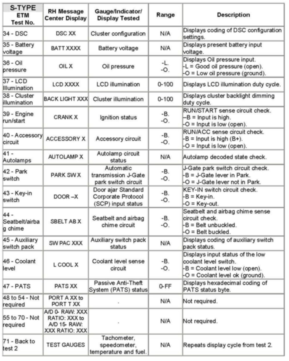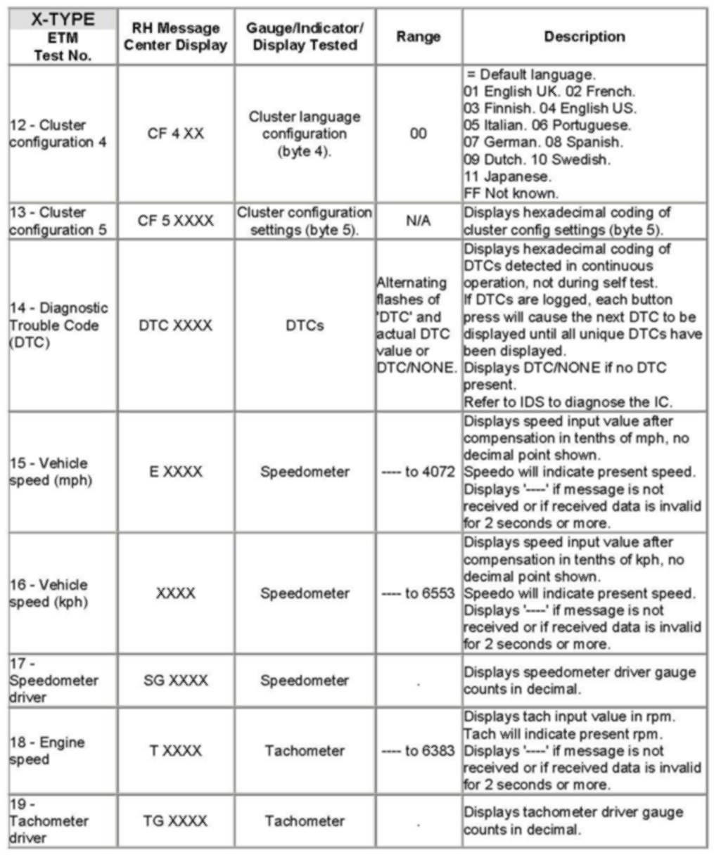 The Instrument Cluster (IC) installed from the start VINs listed above contains a self- diagnostic feature known as Engineering Test Mode or ETM. The ETM can display the status of IC inputs as well as providing a number of other useful features.