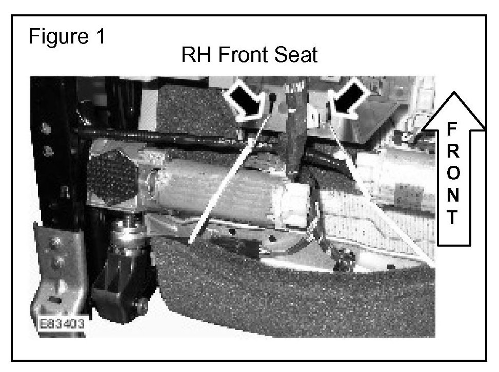 4. Unhook bungee cords from the front seat base. (Figure 1) (FRONT of vehicle indicated by arrow)