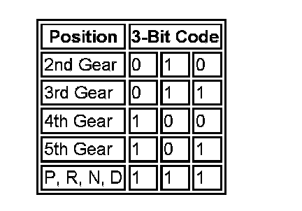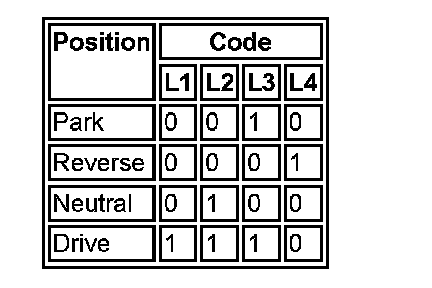 The position switch outputs a 4-bit code to the TCM the bits being labeled L1 -1-4. For the transmission, the following codes are used to identify the selector position.