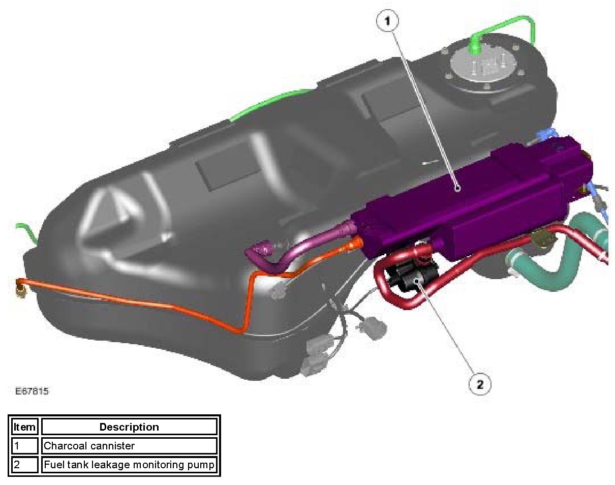 The fuel tank leakage monitoring system periodically checks the evaporative system and the fuel tank for leaks when the ignition is switched off. The fuel tank leakage monitoring pump is connected to the atmospheric vent of the charcoal cannister and incorporates a PTC heating element a normally open valve and a reference orifice. The fuel tank leakage monitoring pump is only operated when the ignition is switched off and is controlled by the ECM. The ECM also monitors the electric air pump operation and the normally open valve for faults. To check the fuel tank and EVAP system for leaks the ECM operates the fuel tank leakage monitoring pump and monitors the current draw. This is compared to a referenced figure established from the current draw when air is pumped through the reference orifice.
