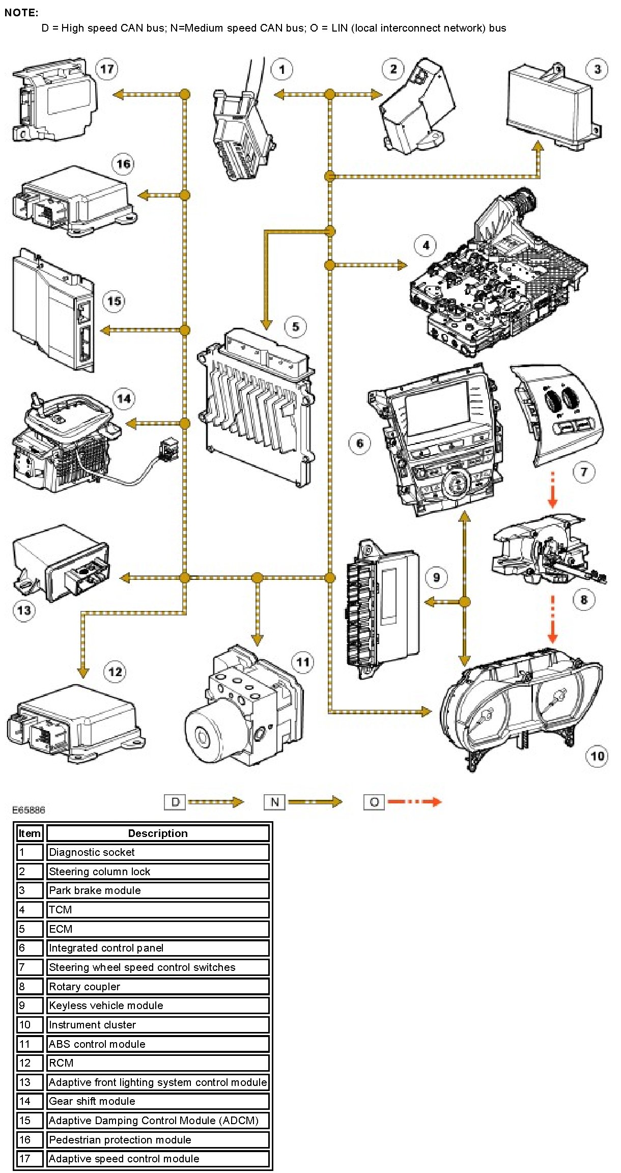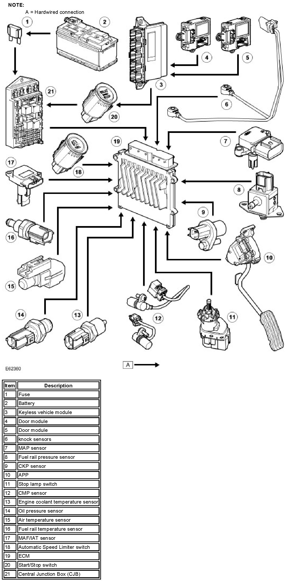- Generator sense (A sense), measures the battery voltage at the CJB.
