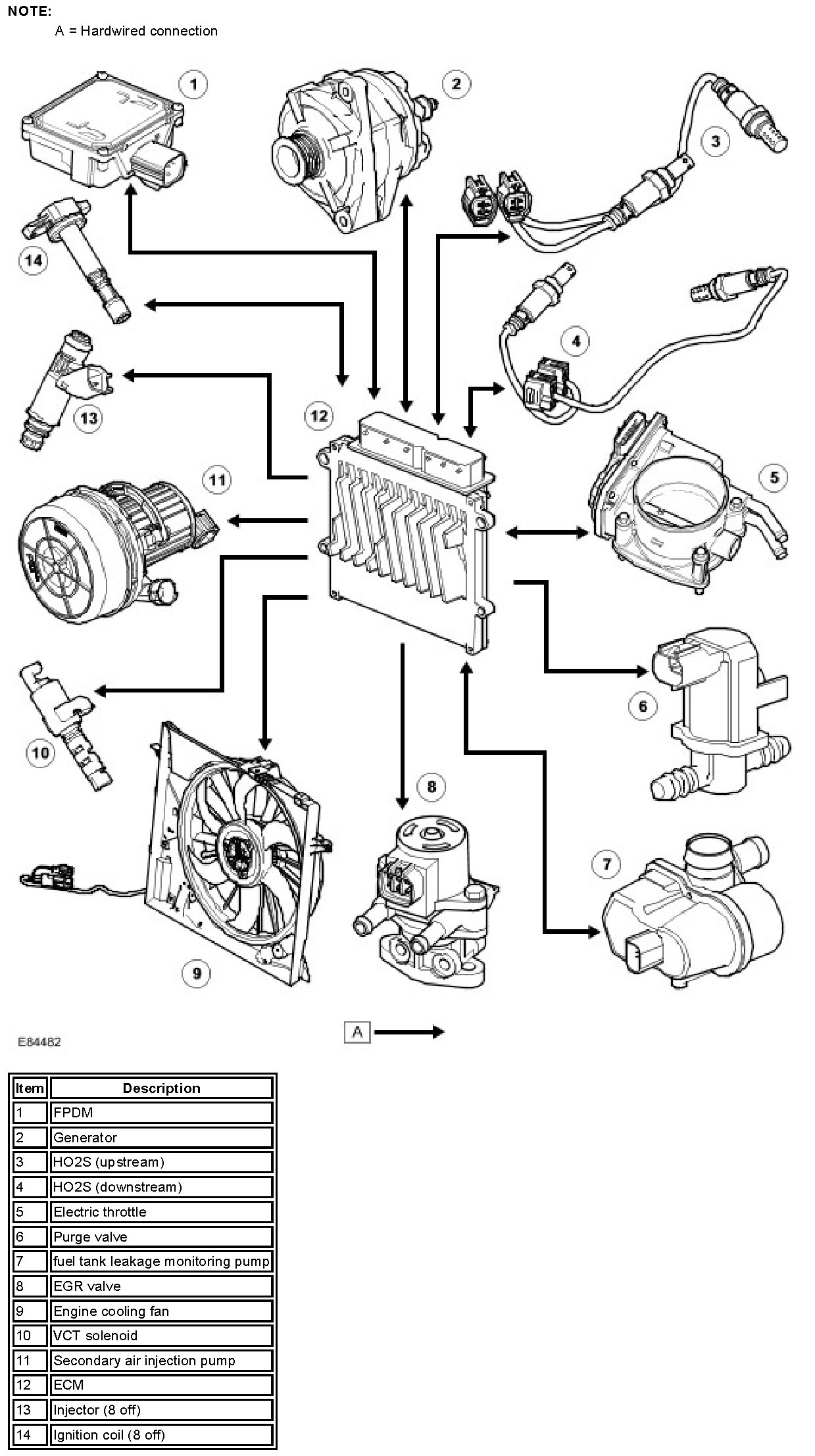 The engine is fitted with eight plug-top coils that are driven directly by the ECM. This means that the ECM, at the point where sufficient charge has built up, switches the primary circuit of each coil and a spark is produced in the spark plug. The positive supply to the coil is fed from a common fuse. Each coil contains a power stage to trigger the primary current. The ECM sends a signal to each of the coils power stage to trigger the power stage switching. Each bank has a feedback signal that is connected to each power stage. If the coil power stage has a failure the feedback signal is not sent, causing the ECM to store a fault code appropriate to the failure.