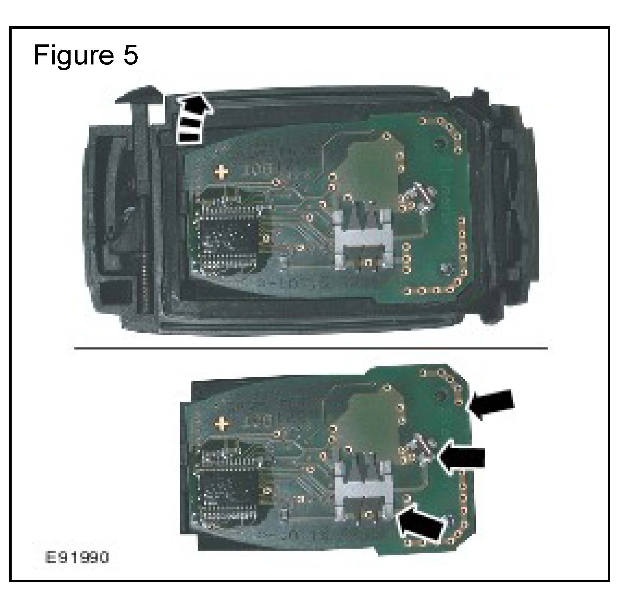 The green printed circuit board, battery or the battery contacts (arrowed in E91988) may NOT be touched during the work procedure. Oil or contamination on either can affect the key fob performance.