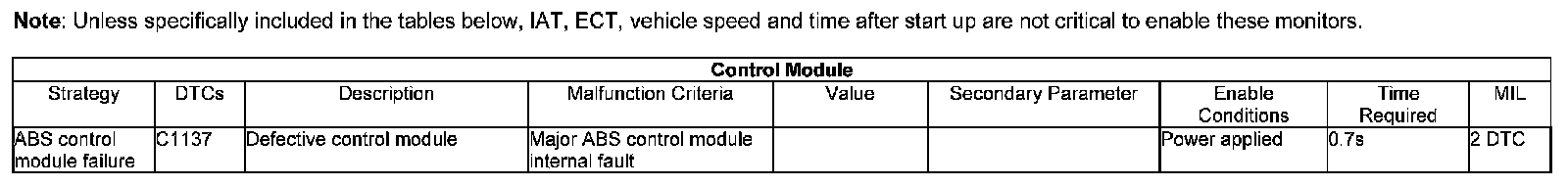The ABS control module runs a number of internal power on initialization self-tests when the ignition is switched on. If any of the self-tests fail then DTC C1137 is logged and the ABS is disabled.