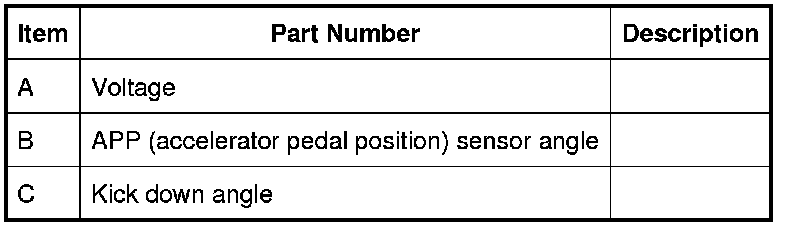 The APP (accelerator pedal position) sensor has two potentiometer tracks which each receive a 5V input voltage from the ECM (engine control module). Track 1 provides an output of 0.5V with the pedal at rest and 2.0V at 100% full throttle. Track 2 provides an output of 0.5V with the pedal at rest and 4.5V at 100% full throttle. The signals from the two tracks are used by the ECM (engine control module) to determine fueling for engine operation and also by the ECM (engine control module) and the TCM (transmission control module) to initiate a kickdown request for the automatic transmission.