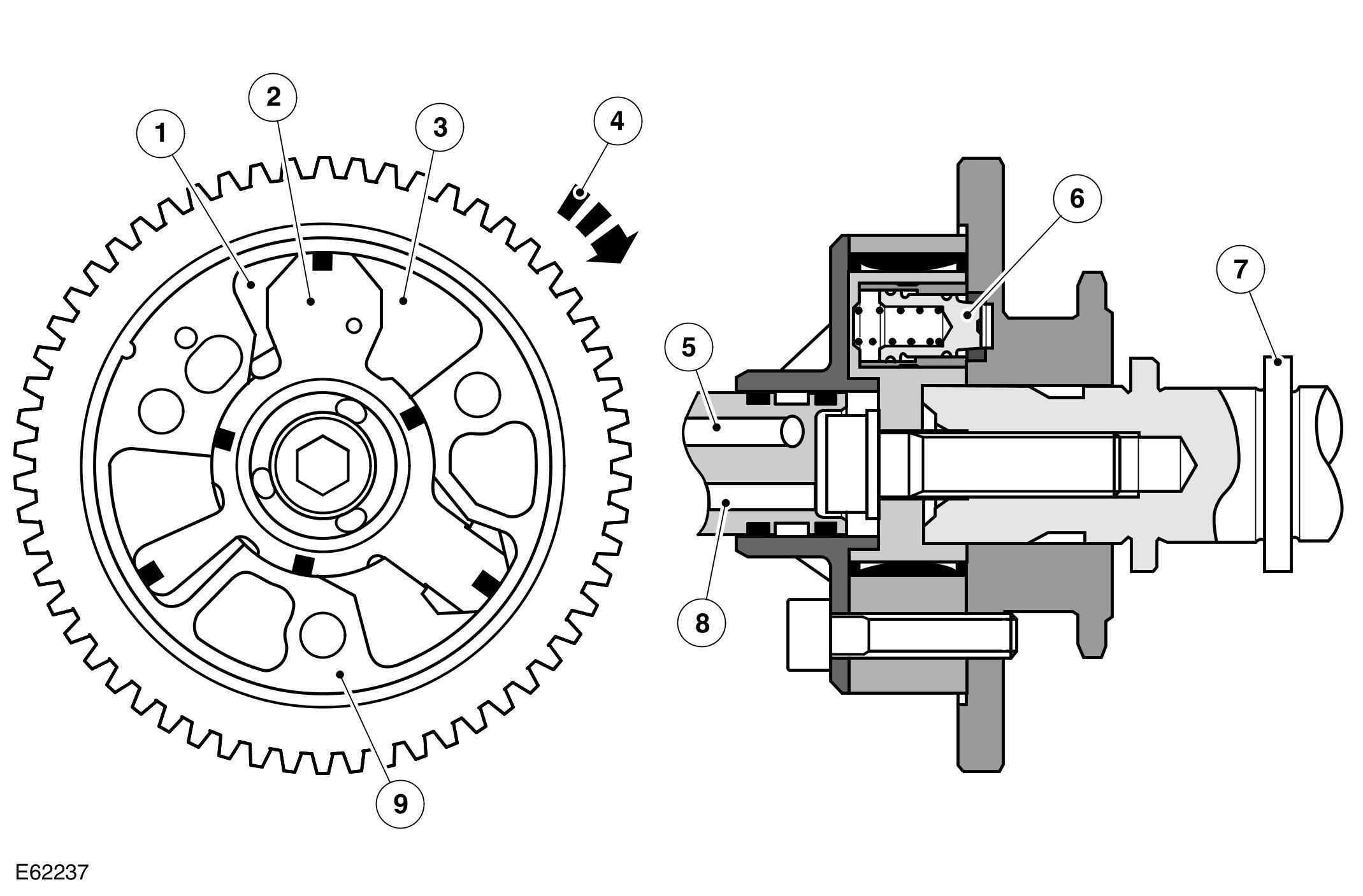 The VVT (variable valve timing) unit is driven by the primary drive chain and rotates relative to the exhaust camshaft. When the ECM (engine control module) requests a retard in camshaft timing the oil control solenoid is energized which moves the shuttle valve in the solenoid to the relevant position allowing oil pressure to flow out of the advance chambers in the VVT (variable valve timing) unit whilst simultaneously allowing oil pressure into the retard chambers.