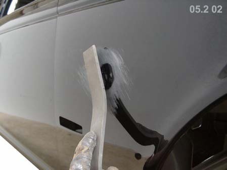 02. First bring the majority of the dent out, use the serrated bump spoon, whilst applying pressure from the back of the panel with the dolly.