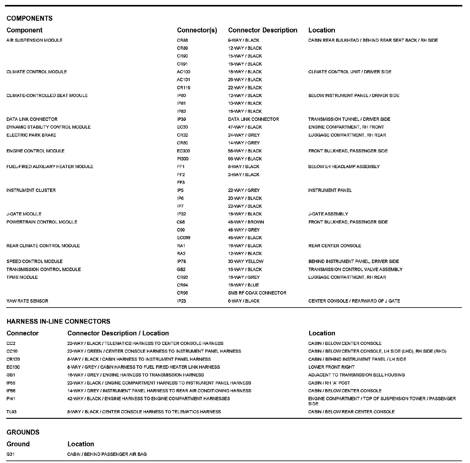 Locations: The location views for Ground Points, In-Line Harness Connectors, Harnesses, and Control Modules depicted within these diagrams can be found at Vehicle/Locations. Locations