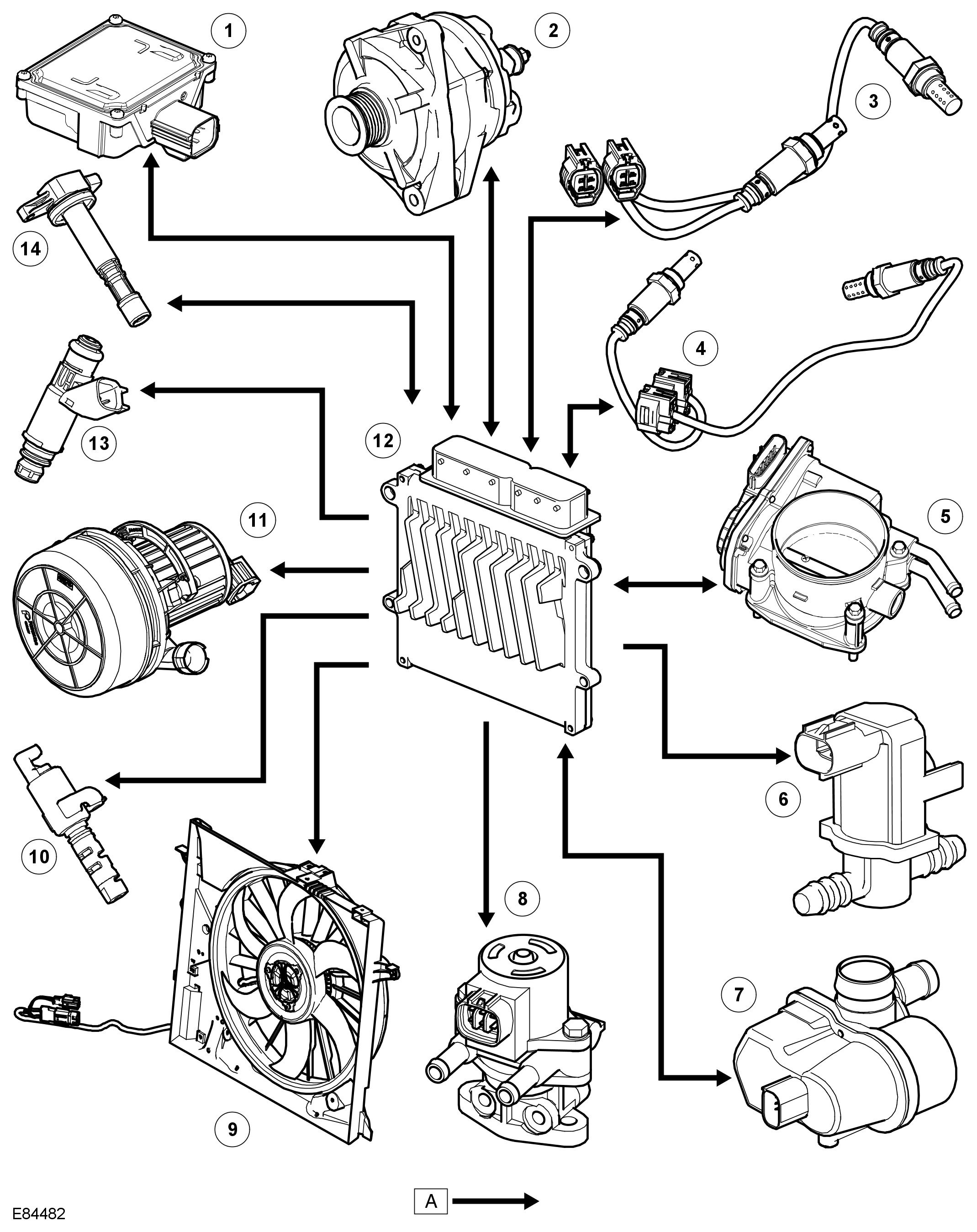 The engine is fitted with eight plug-top coils that are driven directly by the ECM. This means that the ECM, at the point where sufficient charge has built up, switches the primary circuit of each coil and a spark is produced in the spark plug. The positive supply to the coil is fed from a common fuse. Each coil contains a power stage to trigger the primary current. The ECM sends a signal to each of the coils power stage to trigger the power stage switching. Each bank has a feedback signal that is connected to each power stage. If the coil power stage has a failure the feedback signal is not sent, causing the ECM to store a fault code appropriate to the failure.