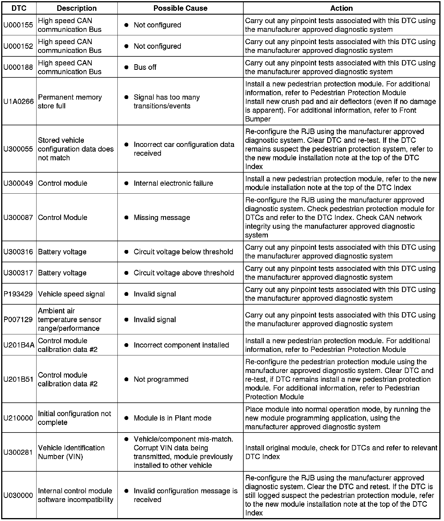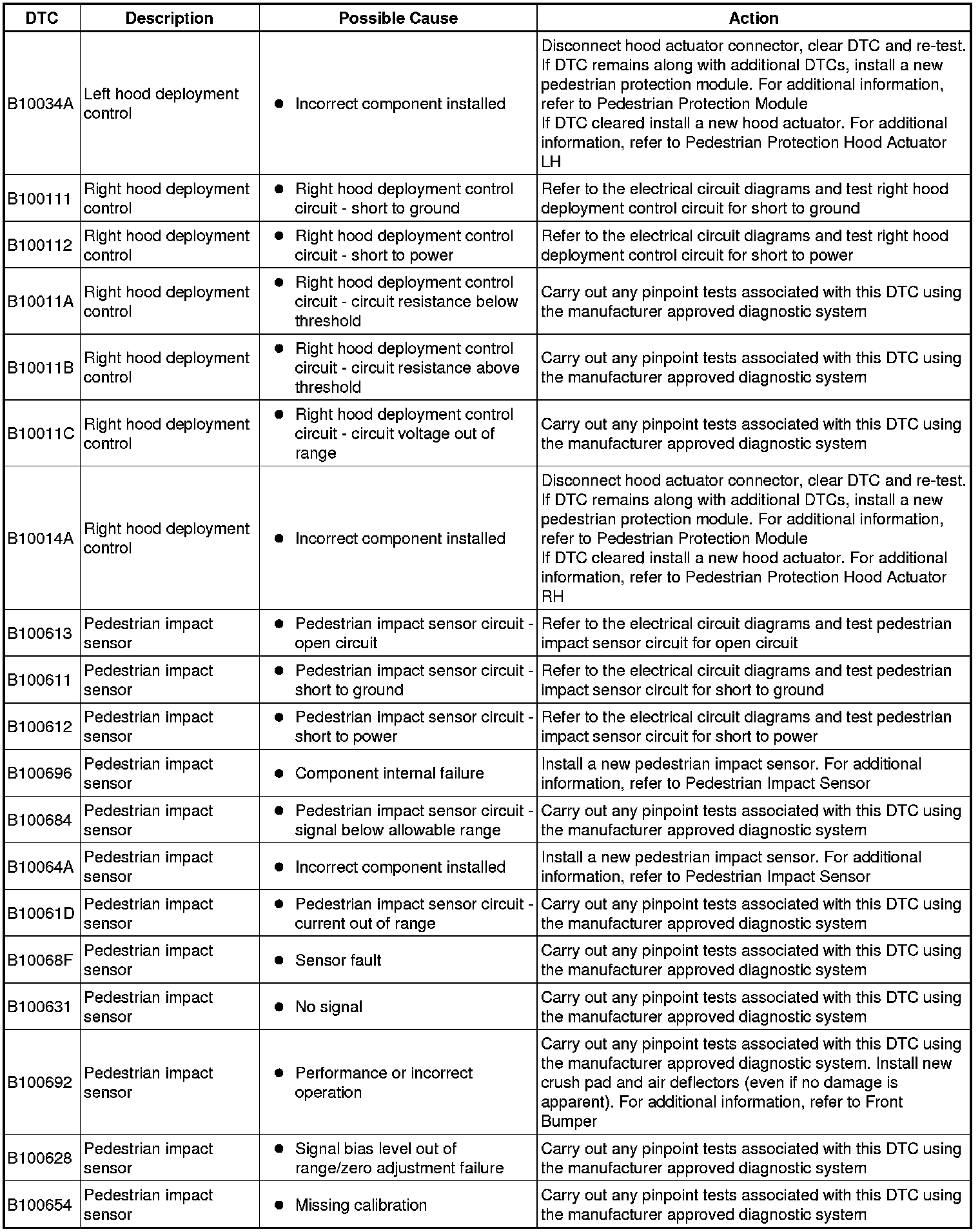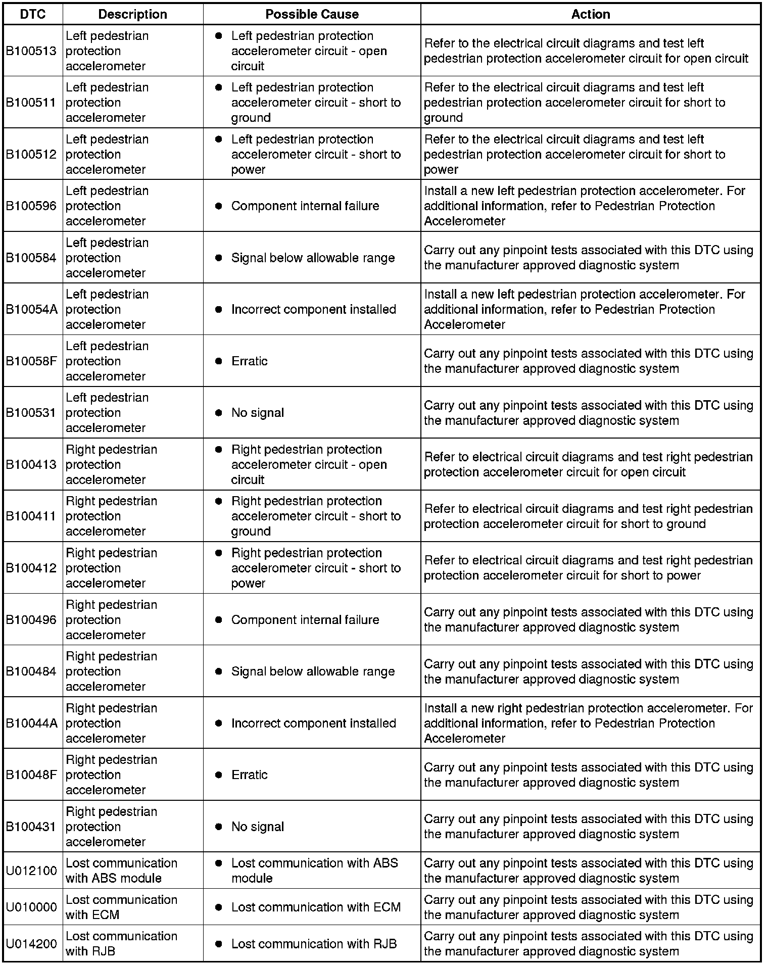 CAUTION: Prior to carrying out any pinpoint tests on the pedestrian protection system the back-up power supply must be depleted. Disconnect the battery and wait two minutes for the back-up power supply to deplete.