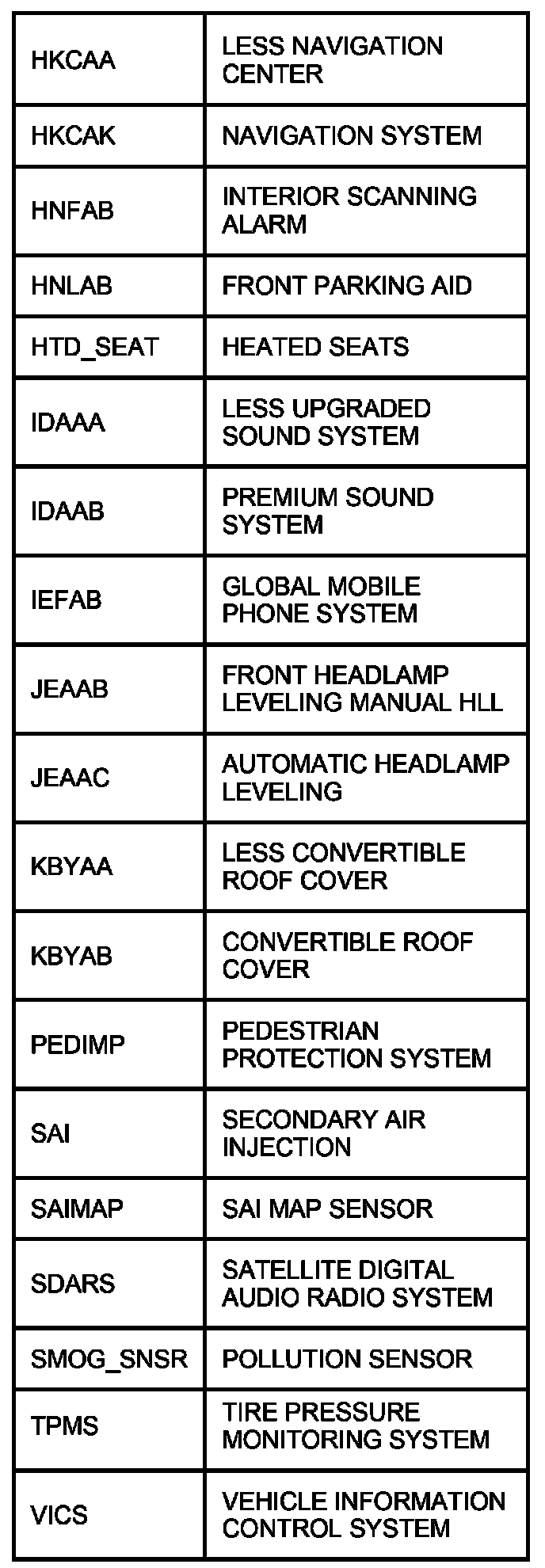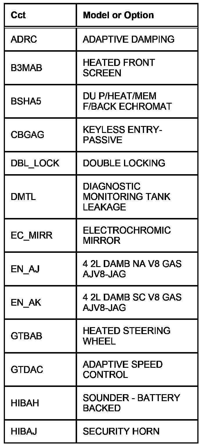 The following table contains a list of circuit (Cct) reference numbers against a description of the applicable model or option. This information should be used in conjunction with the connector pin-out tables to determine the wire configuration of the vehicle under test.