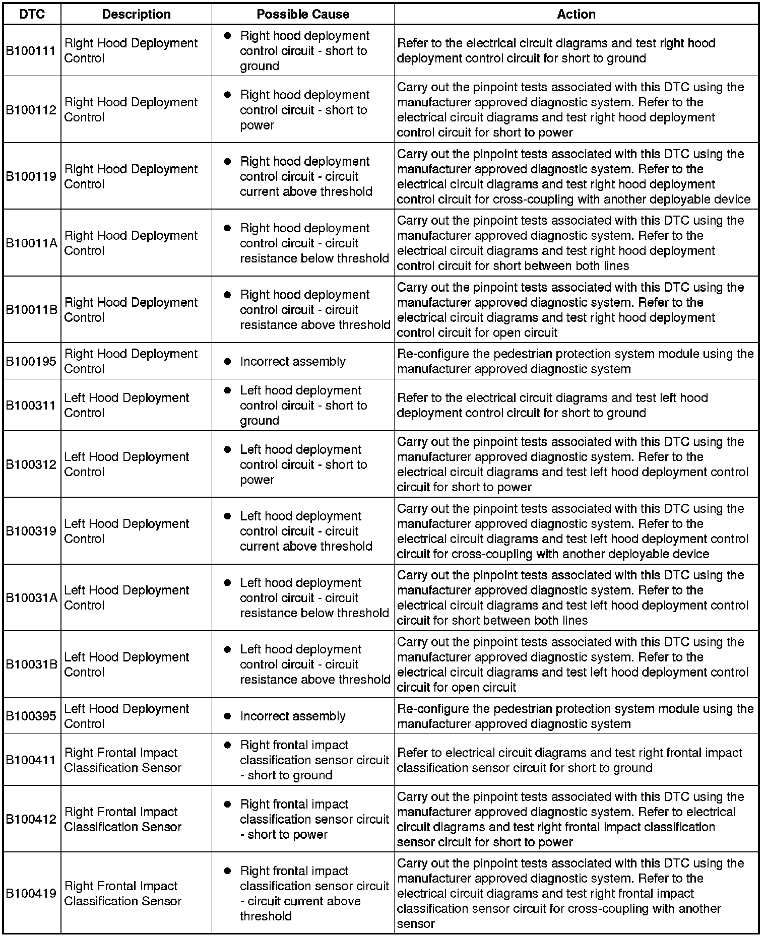 CAUTION: Prior to carrying out any pinpoint tests on the pedestrian protection system the back-up power supply must be depleted. Disconnect the battery and wait two minutes for the back-up power supply to deplete.