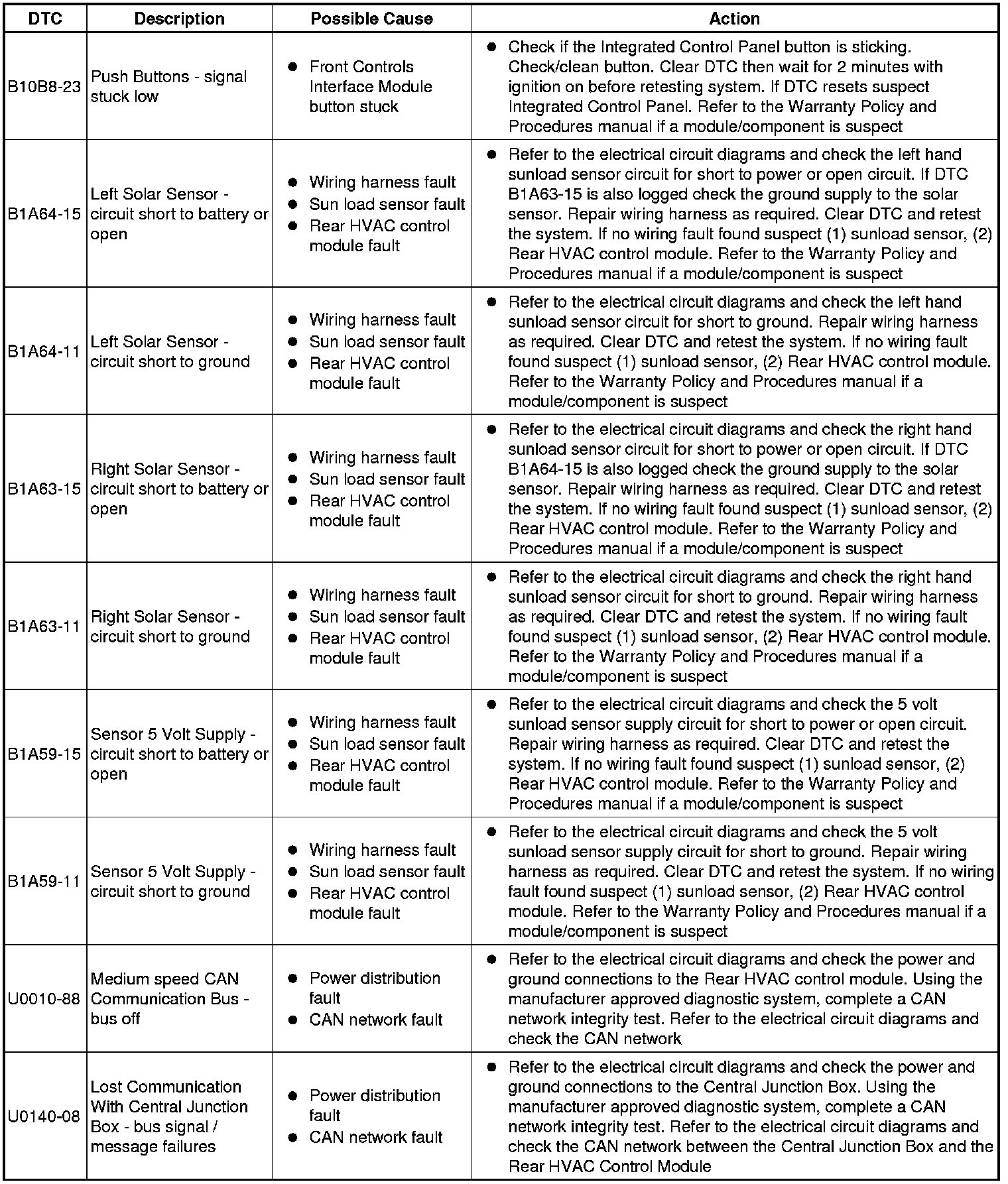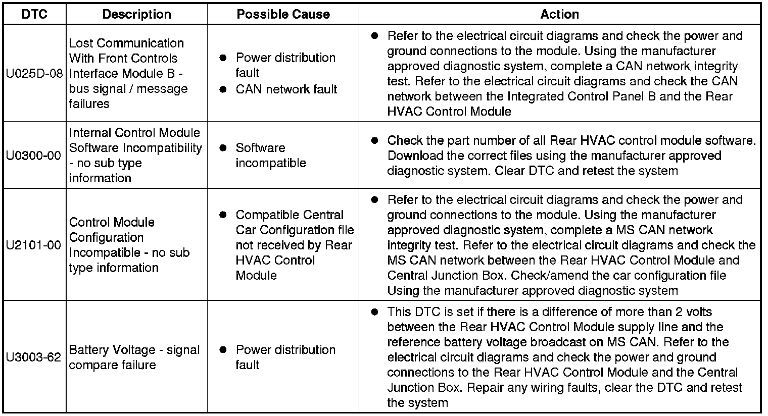 The table below lists all Diagnostic Trouble Codes (DTCs) that could be logged in the Rear Climate Control Module, for additional Diagnosis and Testing information refer to the relevant Diagnosis and Testing Section. For additional information, refer to Climate Control System Initial Inspection and Diagnostic Overview