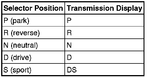 The following table shows the JaguarDrive selector position and the highlighted indication displayed in the transmission display.