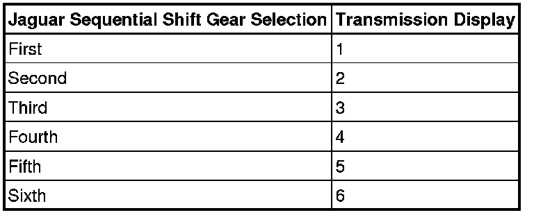 The following table shows the Jaguar sequential shift display. Selections are made using the steering wheel mounted paddle switches.