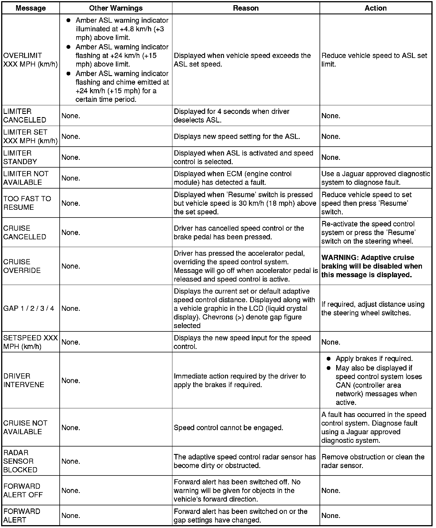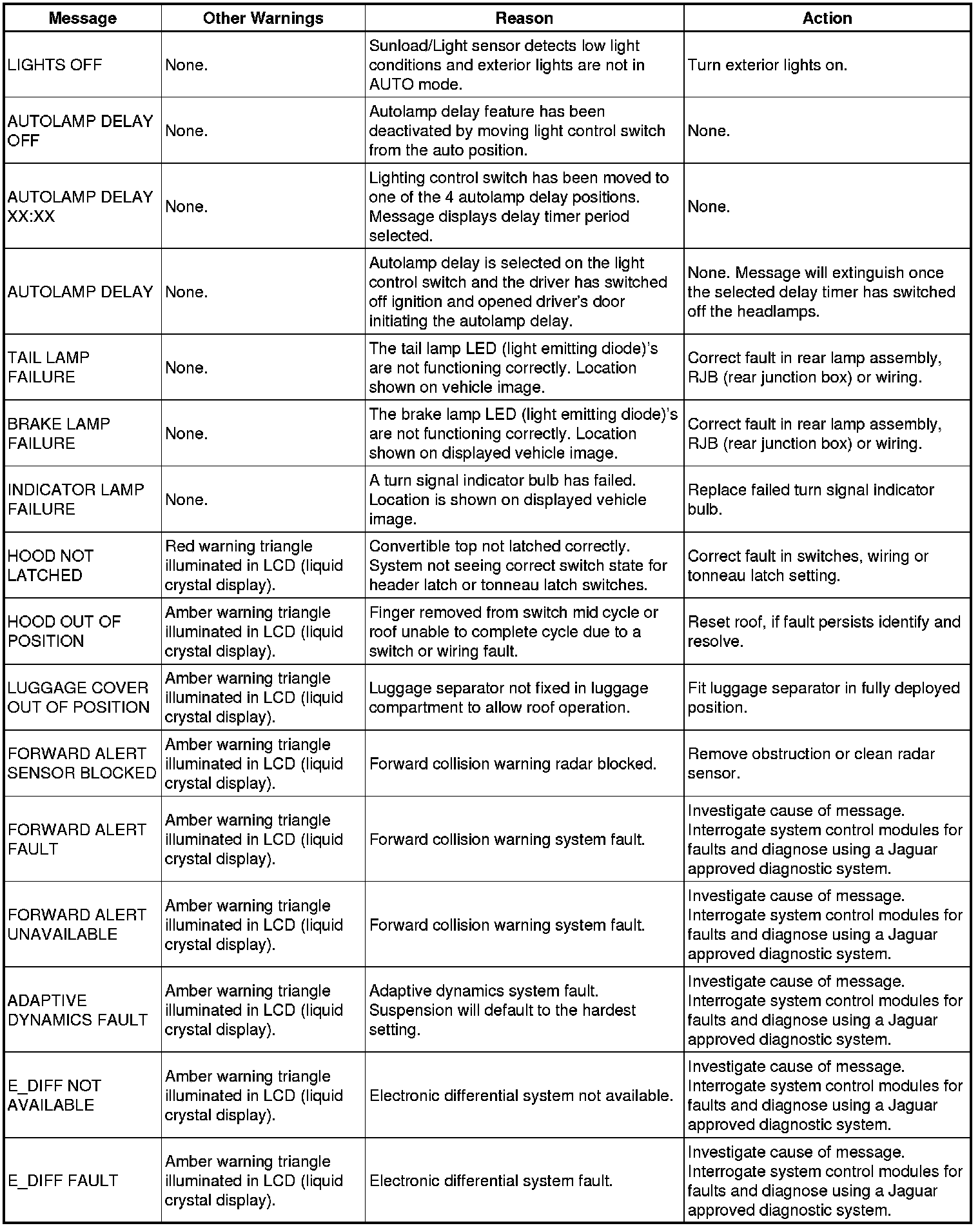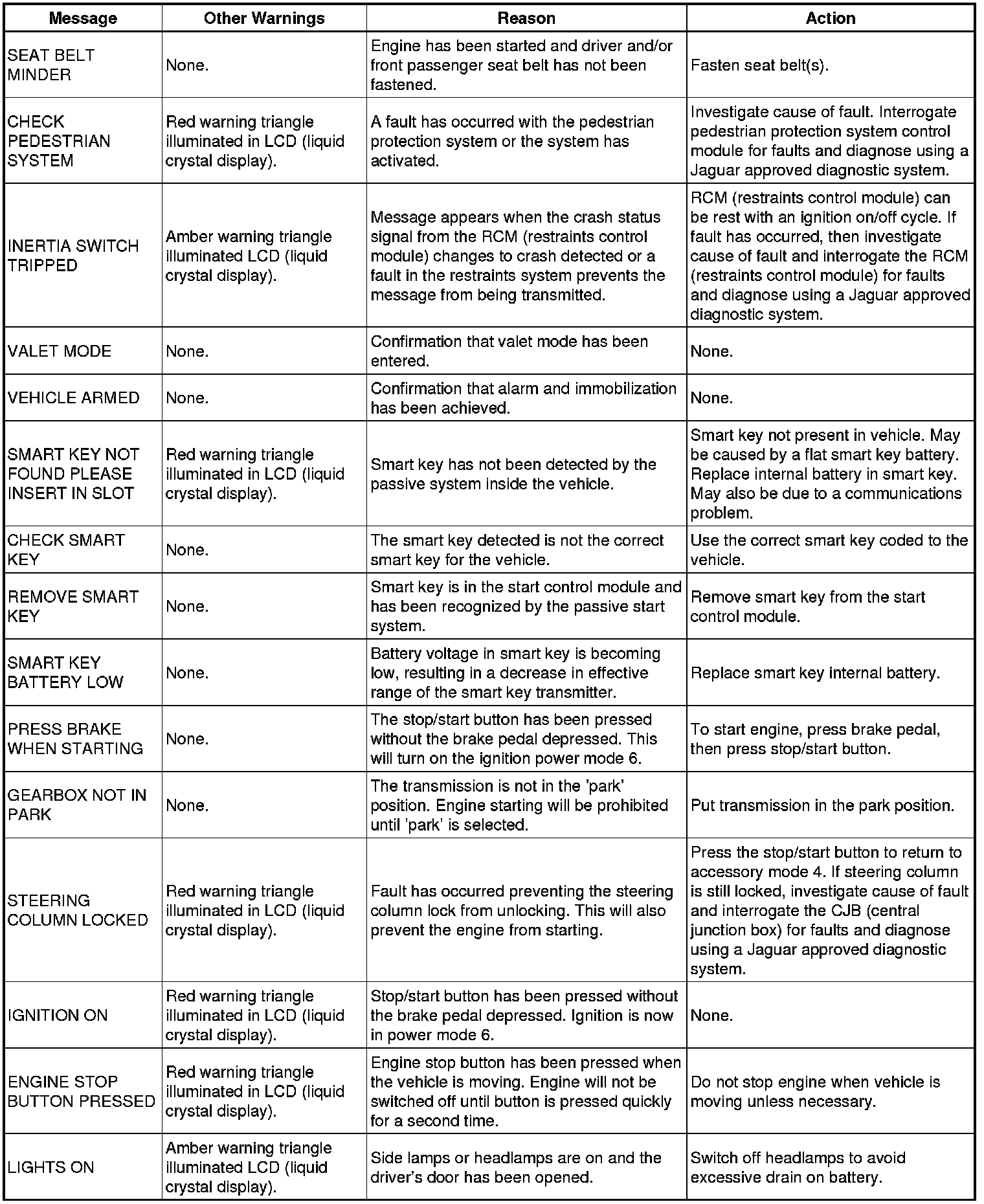 The following table shows the possible messages which can be displayed, other visual or audible warnings and a description of the message.