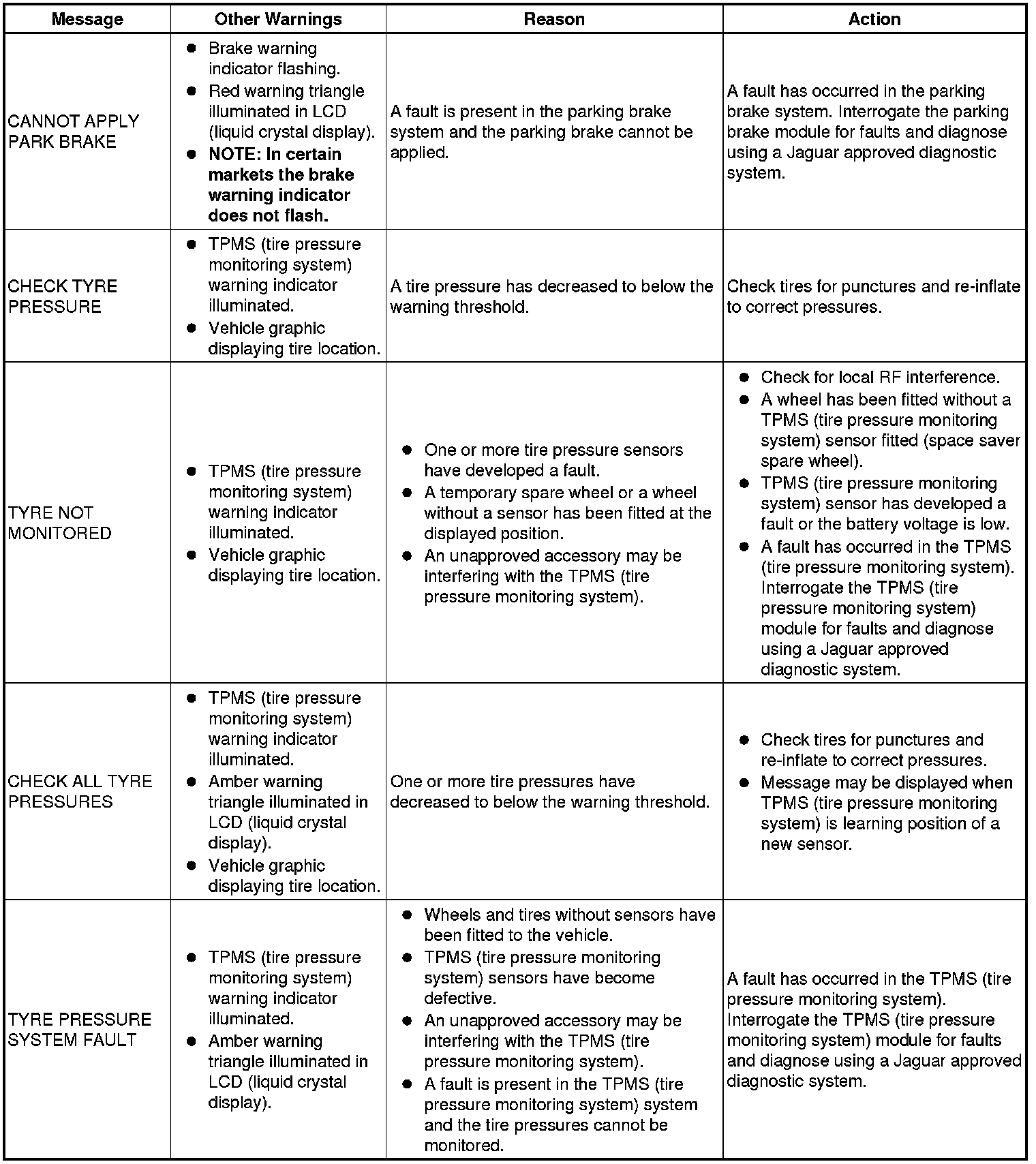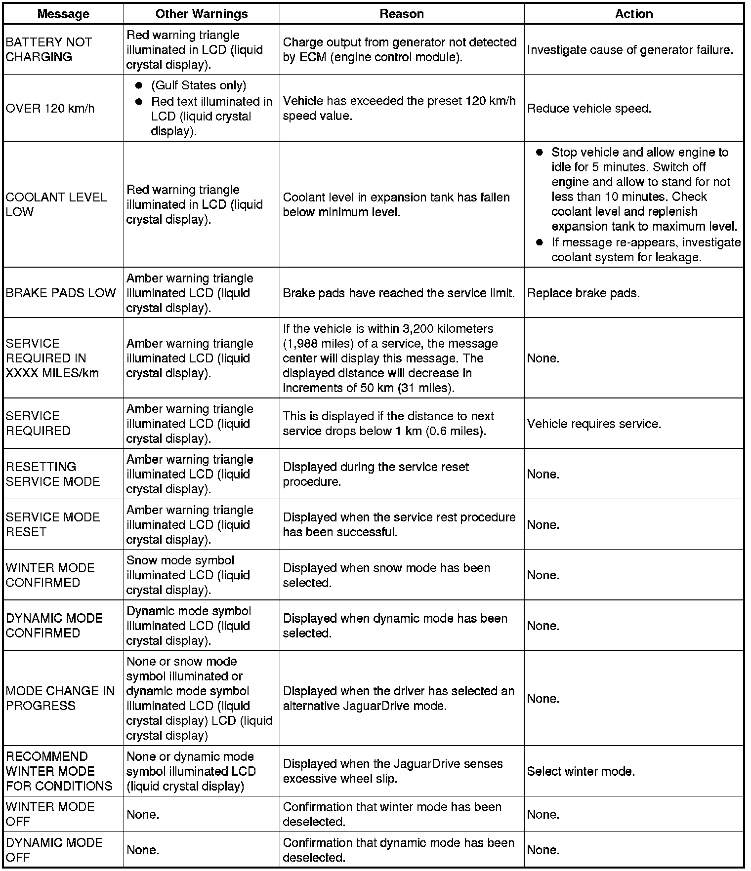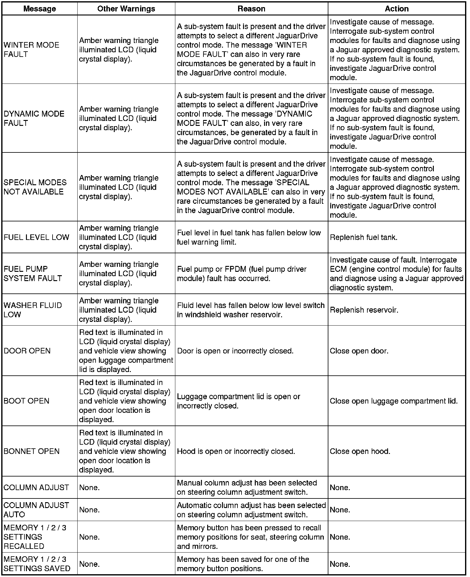 The following table shows the possible messages which can be displayed, other visual or audible warnings and a description of the message.