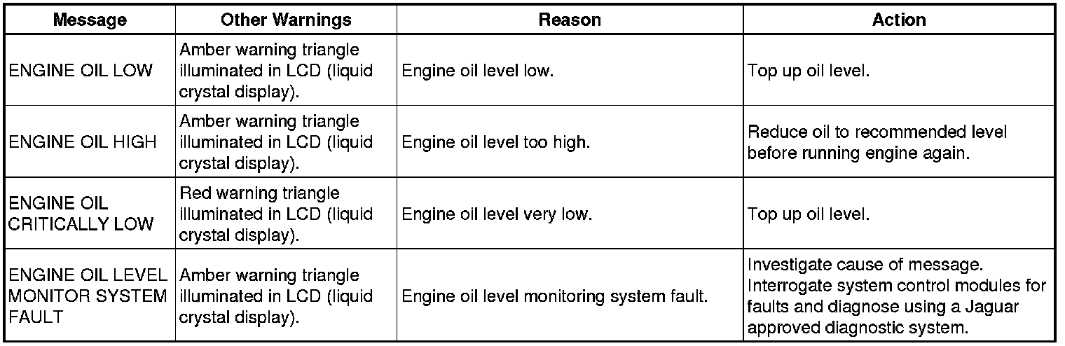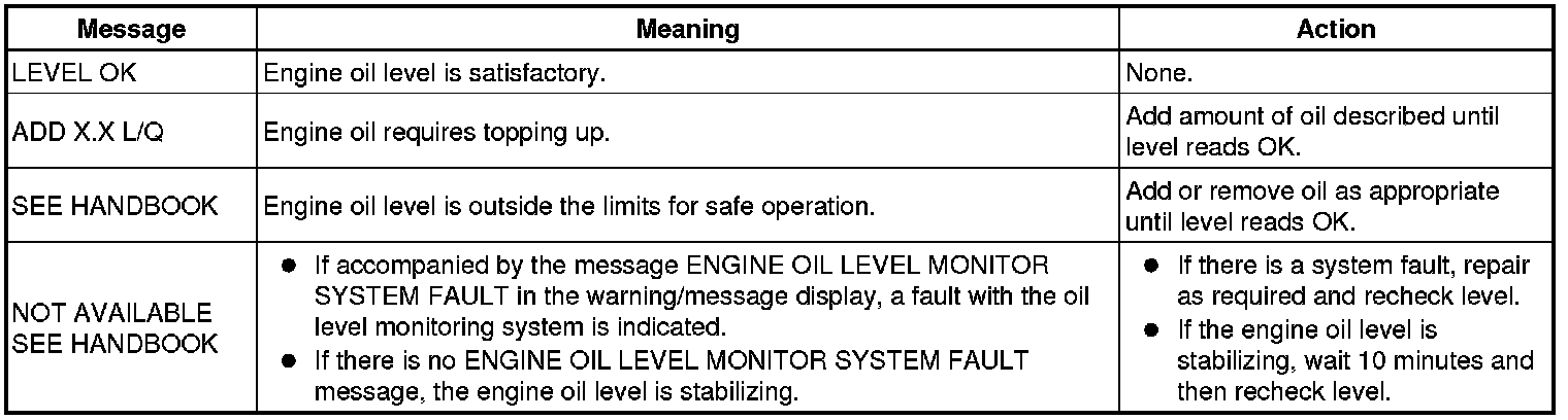 - Engine oil level - the oil level icon and the applicable message from the following table are displayed: