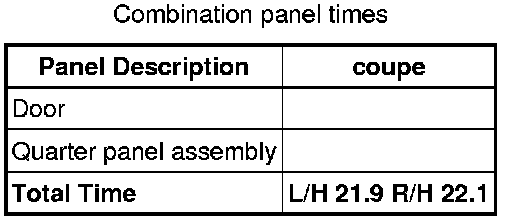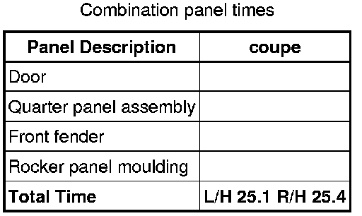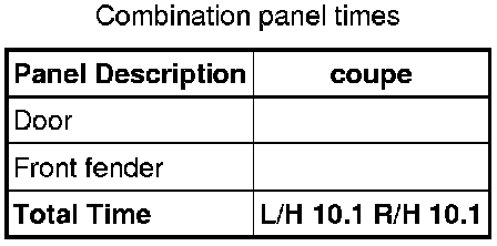 The following panel combination times show the total time to remove/refit body panels, MET items and paint times based on Metallic Clear Over Base Paint process, (blends to adjacent panels are not included).